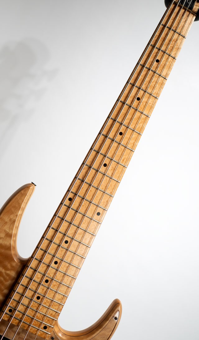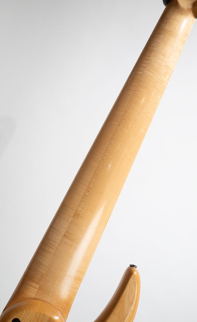 キルトメイプルトップ&アッシュバックのラミネイトボディ。ボルトオン構造のメイプル3pcネック、メイプル指板。レーンプア―ピックアップ&Hazプリアンプを搭載。ピックガードは後付けになります。パーツのくすみにキズや打痕等使用感は全体に点在致しますが、ネックコンディションは良好状態をキープ、フレット、トラスロッド残量もあり、プレイコンディションも良好です。