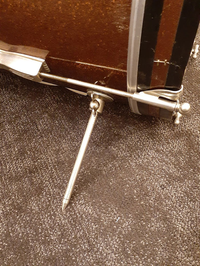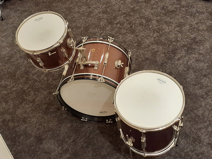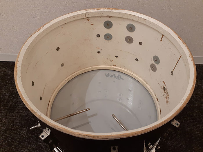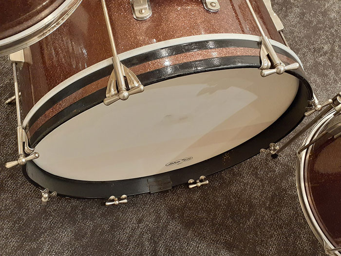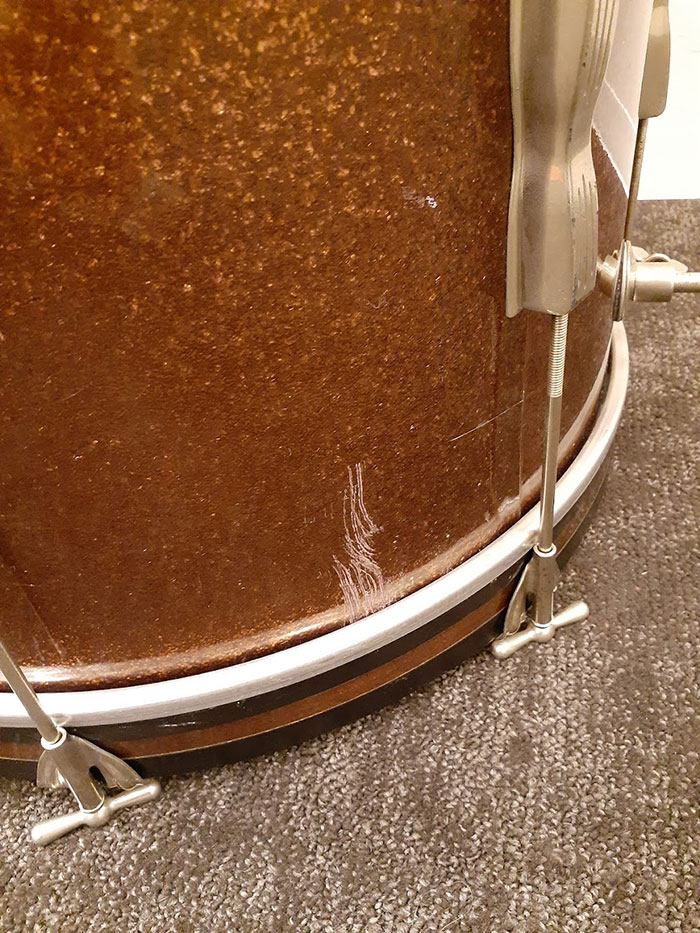 使用されていたため、バスドラムが床に接する部分に若干カバリング表面が擦れた跡があるだけで、カバリング表面も状態良好です。