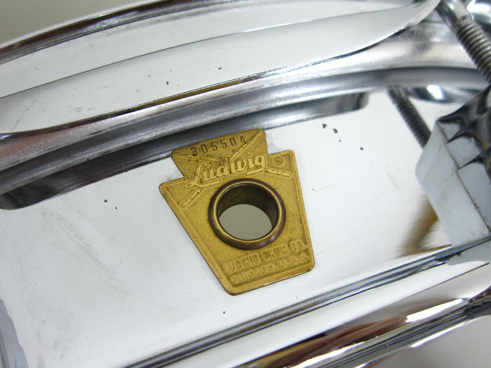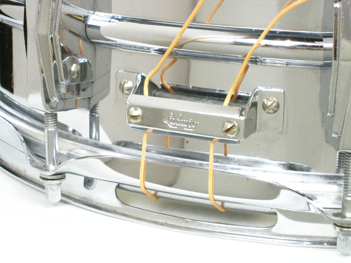 60年代でシェル内側にインクスタンプで「xx 18 1966」と伺えます。シリアルナンバー(305504)キーストーンバッジ装着。マフラースイッチは60年代製のベースボールバットスイッチ(白フェルト)。ストレイナースイッチは60年代のP-83装着で、スナッピーのオンオフはスムーズです。トップボトムフープは1,6mmスティールフープで当時のLudwigオリジナルが装着されています。またオリジナルブラスワッシャーが装着されており全体的にオリジナル性の高さを誇っています。