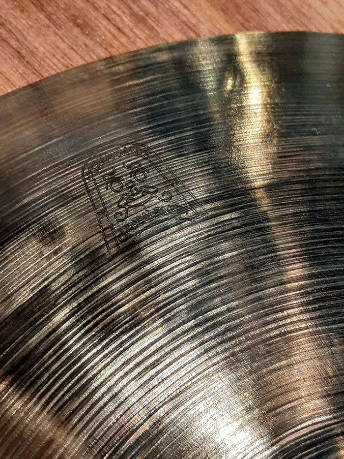 シンバル裏側にはブランドロゴ、製作年、シリアルナンバー、サイズ、ウェイト、品名の刻印がうっすら入っております。