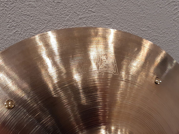 シンバル裏側にはブランドロゴ、製作年、シリアルナンバー、サイズ、ウェイト、品名の刻印がうっすら入っております。