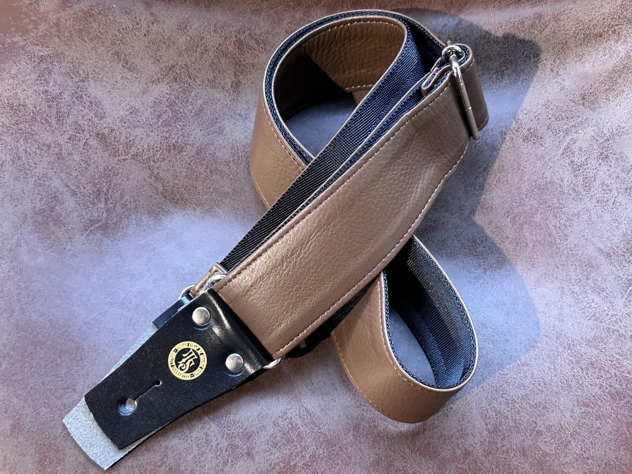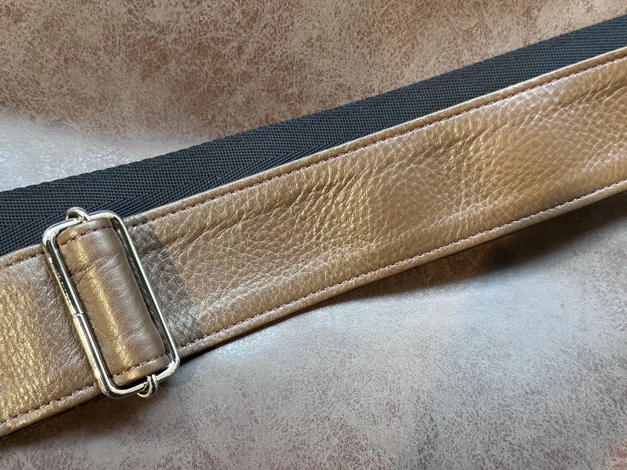 立って演奏した際にギターを動かしやすいナイロン素材と高級感のある本革を使用したデザインと実用性を両立したモデルです。