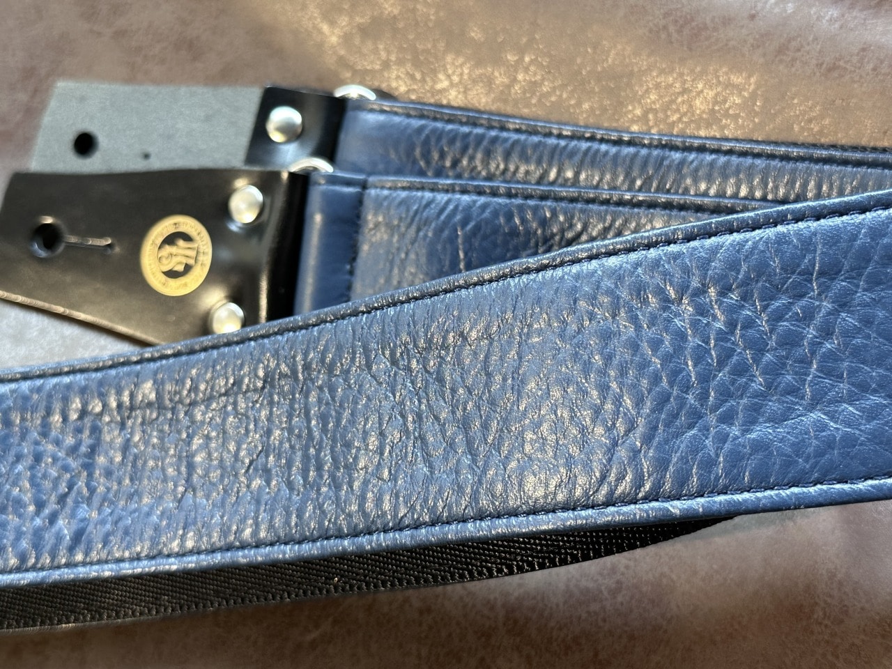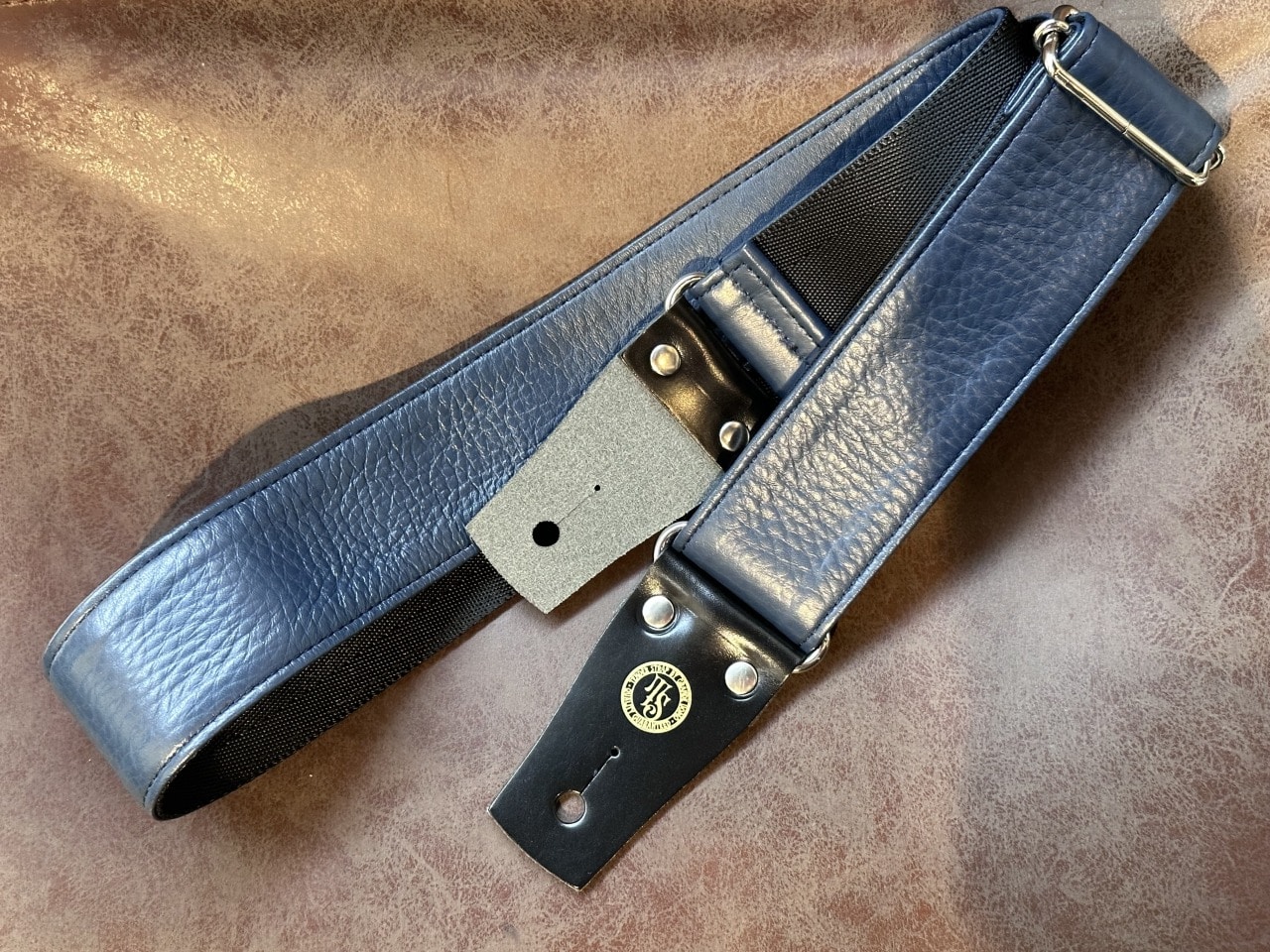表側は国産の染料染めのヌメ革、裏面にはシートベルトと同じナイロン素材が使用されております。