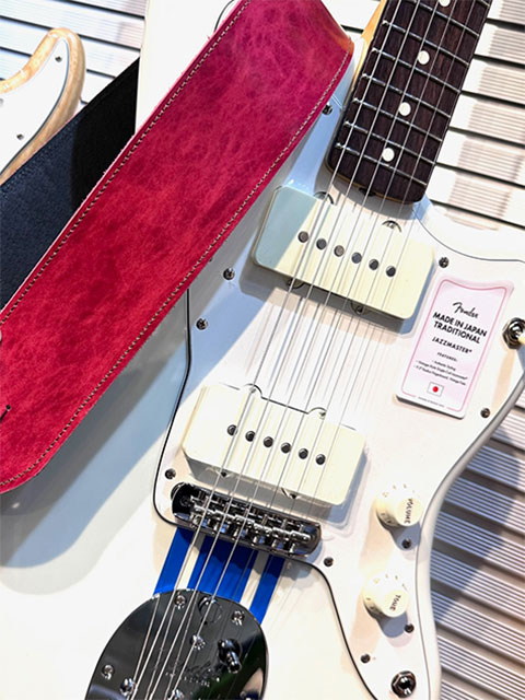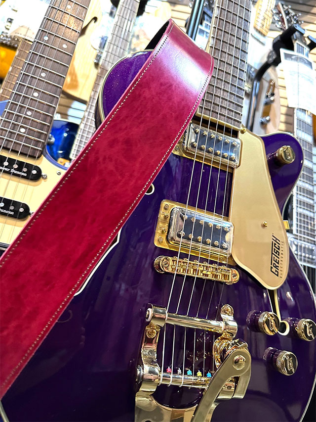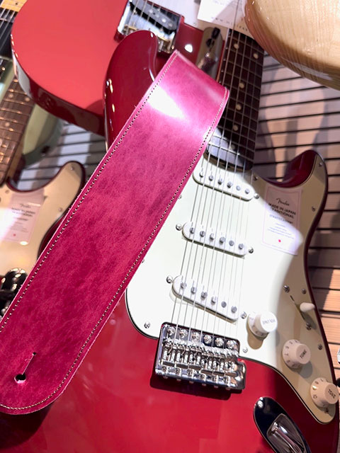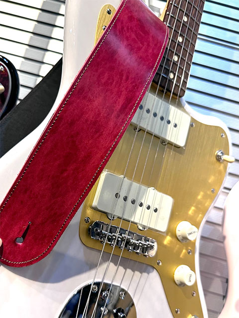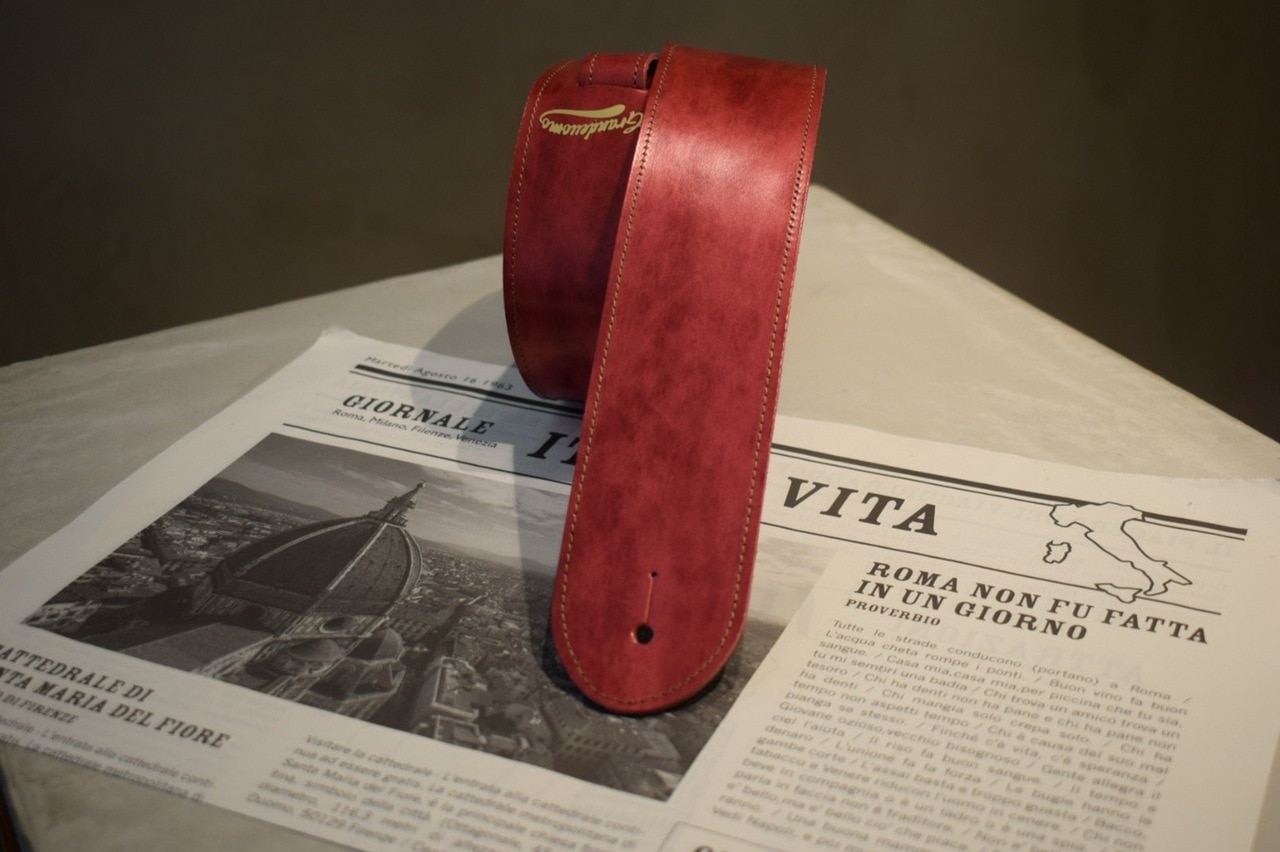 大阪に実店舗を構えるギター・ベースストラップ専門店 Grande uomoの、パール塗装を施し光沢が美しい、珍しいレザーストラップ。