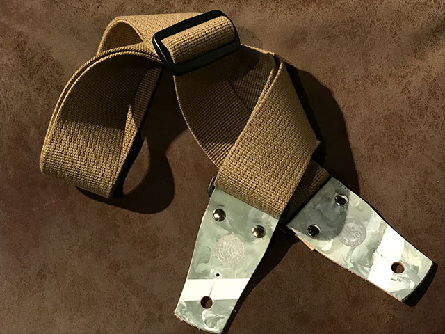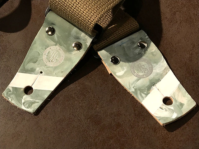 大阪に実店舗を構えるギター・ベースストラップ専門店 Grande uomoがプロデュースする新ストラップブランドTENDER STRAP!! 柔らかくて肩への馴染みの良いアクリル製のベルトを本体に採用したストラップです。 ※こちらはレザーの部分に1点1点ペイントを施した完全一点モノになります。 剣先の革はしっかりとした本革を使う事により、強度も◎ ストラップ本体の素材には柔らかくて肩への馴染みの良いアクリル製を使用し、ベルト調整のバックル部分にはギターを傷つけにくいプラスティックパーツのものを採用しております。可愛さとは裏腹に、使い心地は最高です。 また、ストラップピン取り付け部分には、しっかりとした本革を使う事により革がへたりにくくなっております。 革のワンポイントが美しい!1点1点ペイントされて、まったく同じものは存在しない!自分だけのデザイン! ストラップの幅(肩にあたる部分) 5cm ストラップの調整可能な長さ【ストラップピンの取付穴の間の長さ】 約85cm?140cmまで調整可能 ストラップピンの取り付け穴のサイズ 8mm 本体素材:アクリル製テープ 革素材:牛革 ※手作業でペイントされている製品となります。1点限りの商品となります。また、ペイント作業時にどうしても革裏地に塗料が付着してしまいます。予めご了承くださいませ。