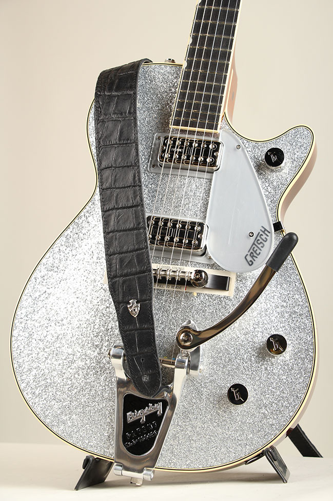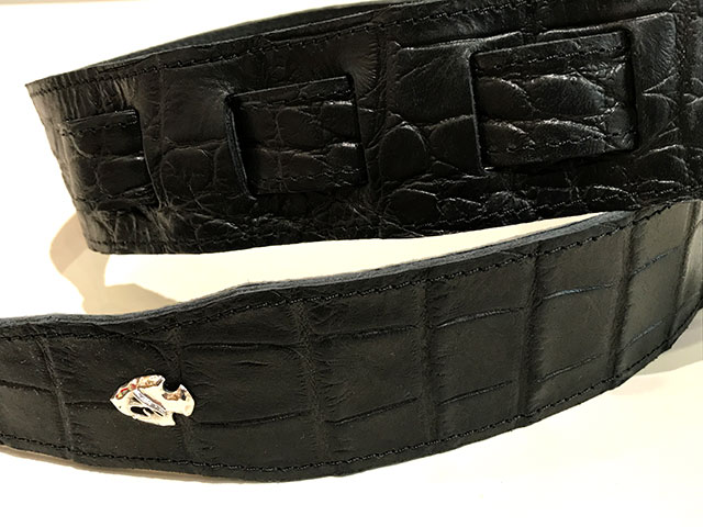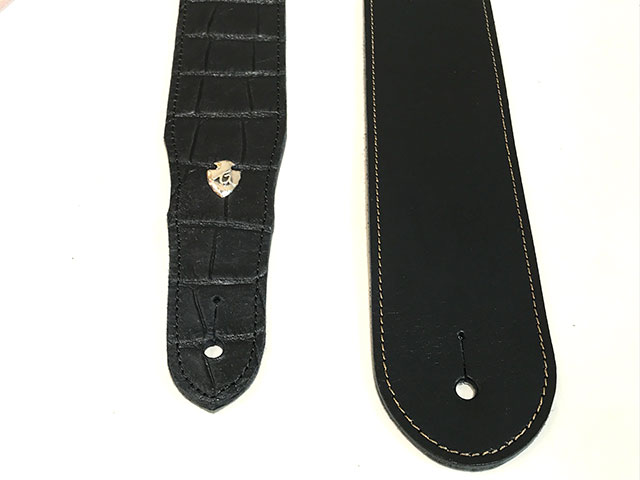 高品質な型押しクロコの姫路レザーを使用した【一生かけて育て上げたい】ギターストラップ。裏側に豚ヌメ革を貼った豪華な仕様です。5cm幅で少しスリムなスタイル。シックなカラーの楽器にもベストマッチ、クールなデザインがカッコいい!スリムなタイプ、だけどしっかりと安心感のあるストラップをお探しだった方にもベストマッチです。