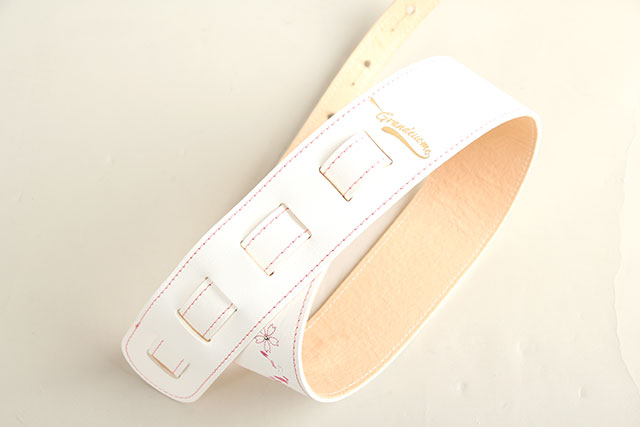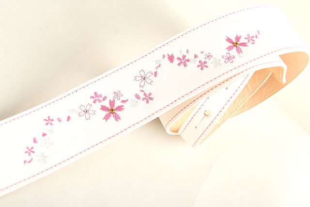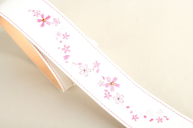 楽器を華やかに彩る美しい白のレザーに、桜の刺繍と、こっそり忍ばせたスタッズのデザインで繊細に仕上げられた1本です。音楽に情熱を注ぐあなたにふさわしい一本をぜひ手に入れてください。
