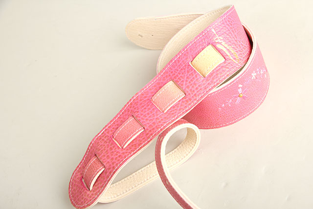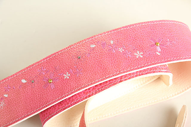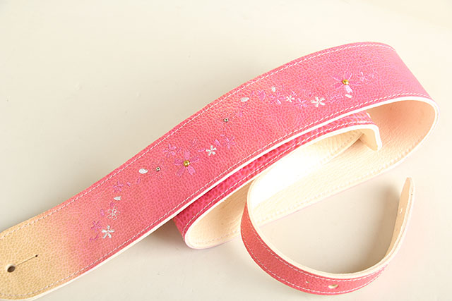 1つ1つ丁寧に仕上げられる美しいグラデーションの染色と、繊細な桜の刺繍デザイン、きらりと光るスタッズデザインが楽器を華やかに彩る、G-Premium Sakura Fade Special。こっそりとはめ込まれたスタッズの散りばめ具合が絶妙。Grande uomoの職人お二人の人柄が垣間見れる素晴らしいストラップに仕上がっています。