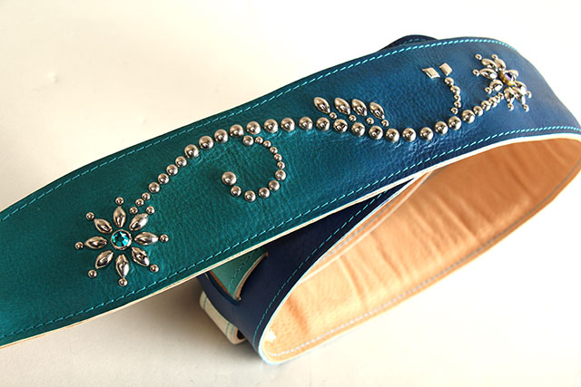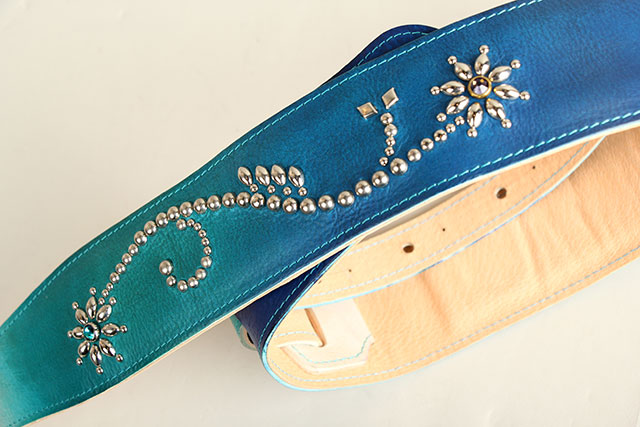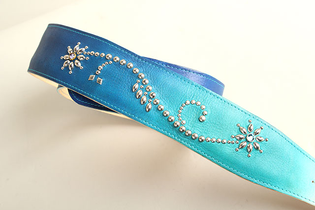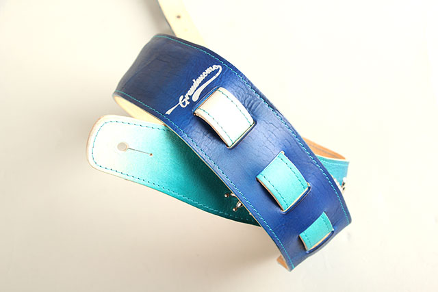 1つ1つ丁寧に仕上げられる美しいグラデーションの染色と、Margaretをイメージしてデザインされた繊細なスタッズ楽器を華やかに彩る、G-Premium Ocean Blue Fade Studs Margaret。こっそりとはめ込まれた2つのストーンの色合いが絶妙で、Grande uomoの職人お二人の人柄が垣間見れる素晴らしいストラップに仕上がっています。