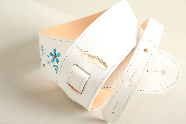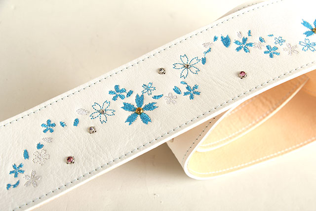 楽器を華やかに彩る美しい白のレザーに、雪の中で咲き誇る桜、光が重なり輝く様子を表現したストーンが非常に美しく、繊細に仕上がった1本です。音楽に情熱を注ぐあなたにふさわしい一本をぜひ手に入れてください。