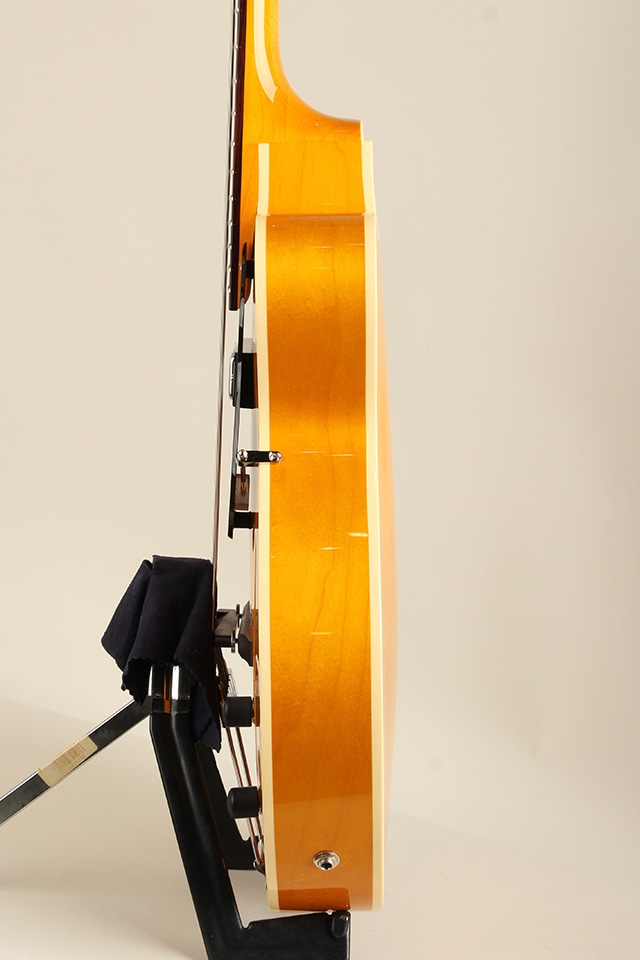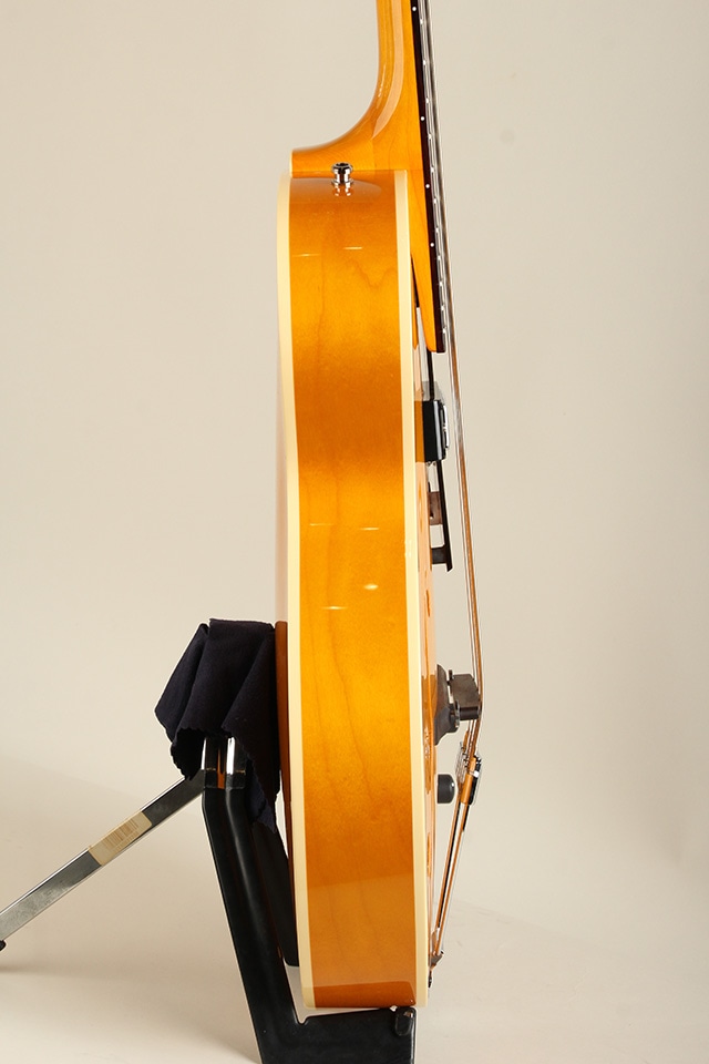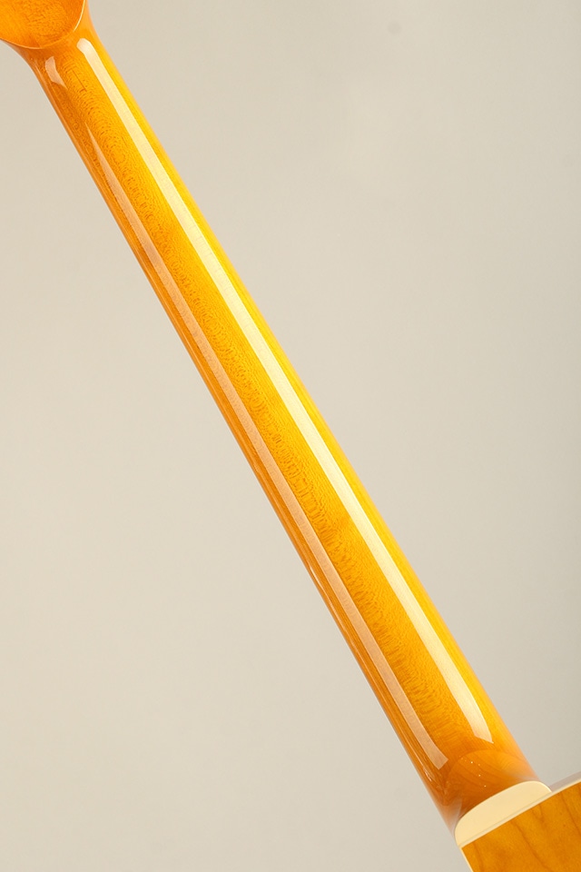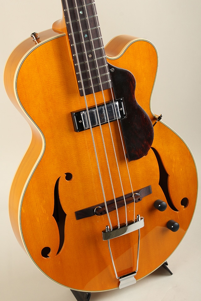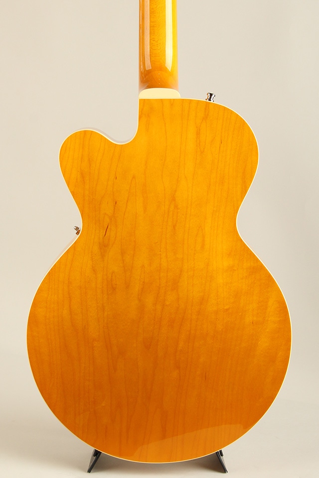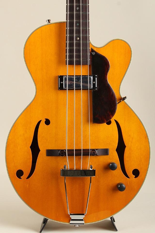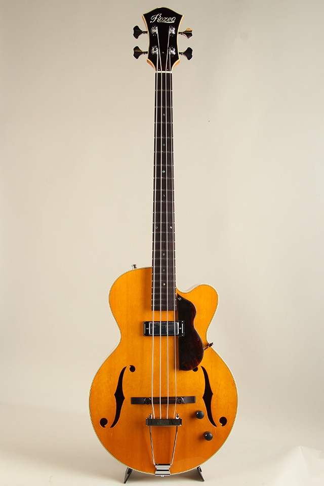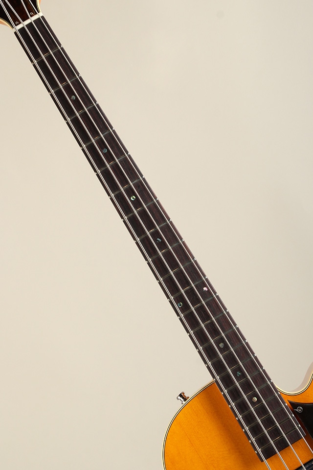 総重量約2,5kgと軽量なウェイトのフルアコベース、長年箱物を制作して来た技術と経験をインストールし、アーチドトップ&バックを始めテールピースや木製のブリッジサドルにfホールと言ったジャズギターの要素が多く見受けられるクラシカルなモデルになります。ボディトップにはスプルースをセレクト、ボディサイド&バックにはメイプルが使用され、ピックアップはフロント一発とシンプルなスペックも印象的です。