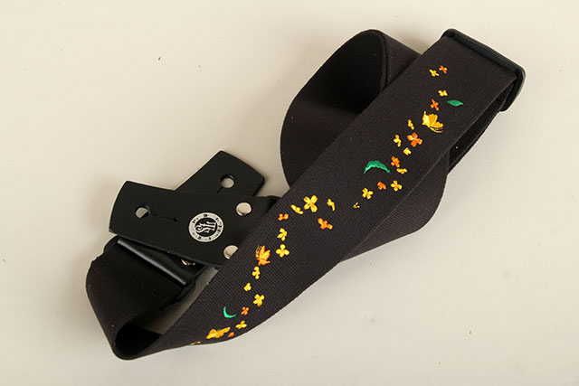 ストラップ本体の素材には柔らかくて肩への馴染みの良いアクリル製を使用し、ベルト調整のバックル部分にはギターを傷つけにくいプラスティックパーツのものを採用しております。