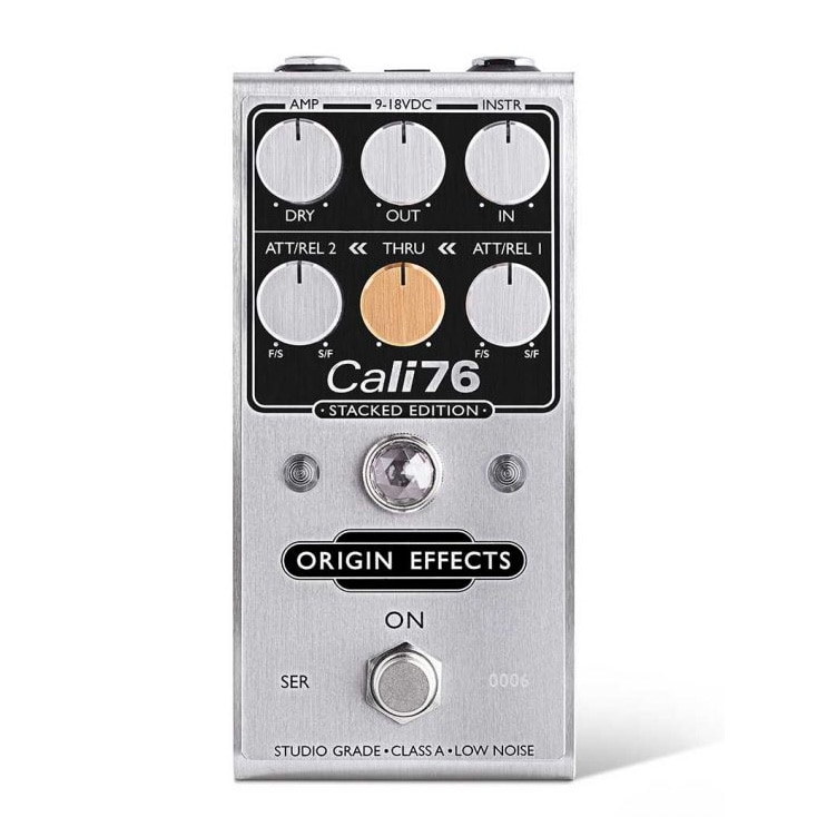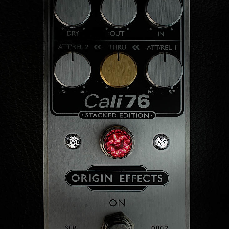 ゴールドカラーの”THRU”ノブがCali76 Stacked Editionの中心に配置されているのが分かると思います。スタジオグレードのトランジスタアンプをコントロールするインプットノブはシグナルが最初のコンプレッサーの固定スレッショルドに対してどれだけ入力するかを決定しますが、この”THRU”ノブは一段目のコンプレッサーが二段目のコンプレッサーへどれだけ出力するかをコントロールします。