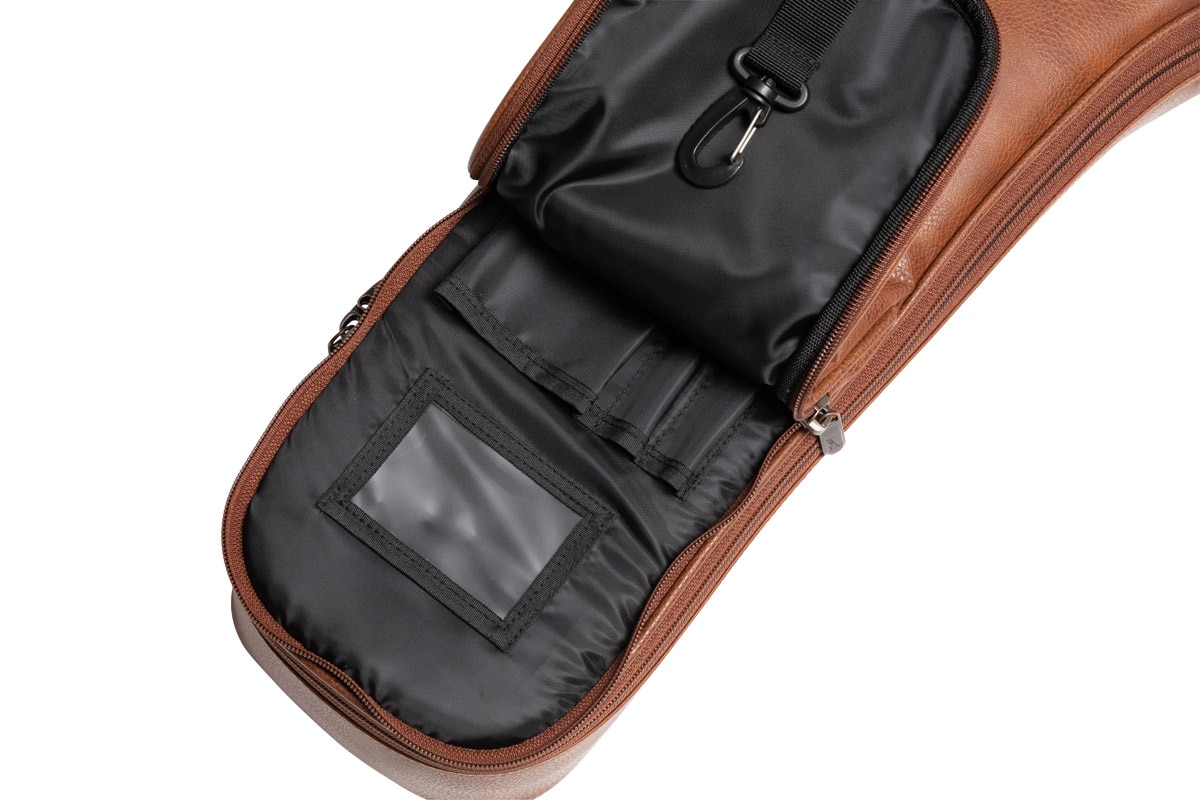 2つの収納スペースがあり、1つはヘッド近くの上部に、もう1つは前面の大きなスペース。楽譜やケーブル、チューナーやカポなど、練習に必要なアイテムの持ち運びもらくらく!