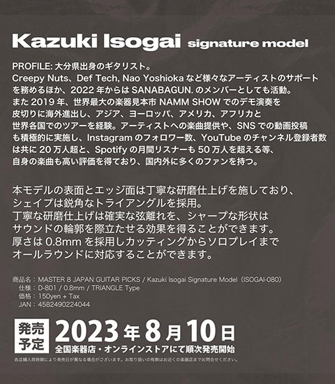 約半世紀に渡り世界の楽器業界でピックの製造開発の中心を担ってきた、 国内最大のギターピック専業製造会社である池田工業のオリジナルピックブランド、Master 8 JAPANのアーティストシリーズ!デザイン・使用感ともにアーティスト本人の拘りが詰まった妥協なき1枚に完成。