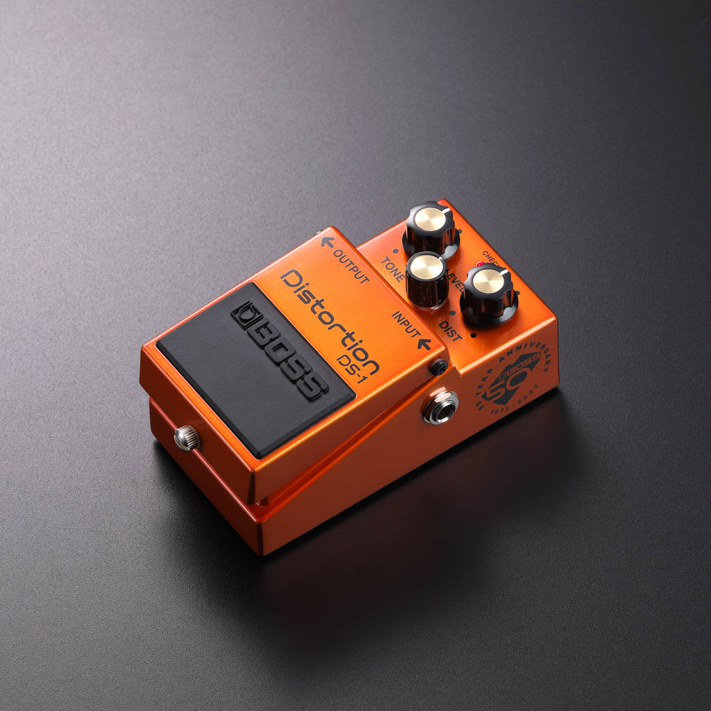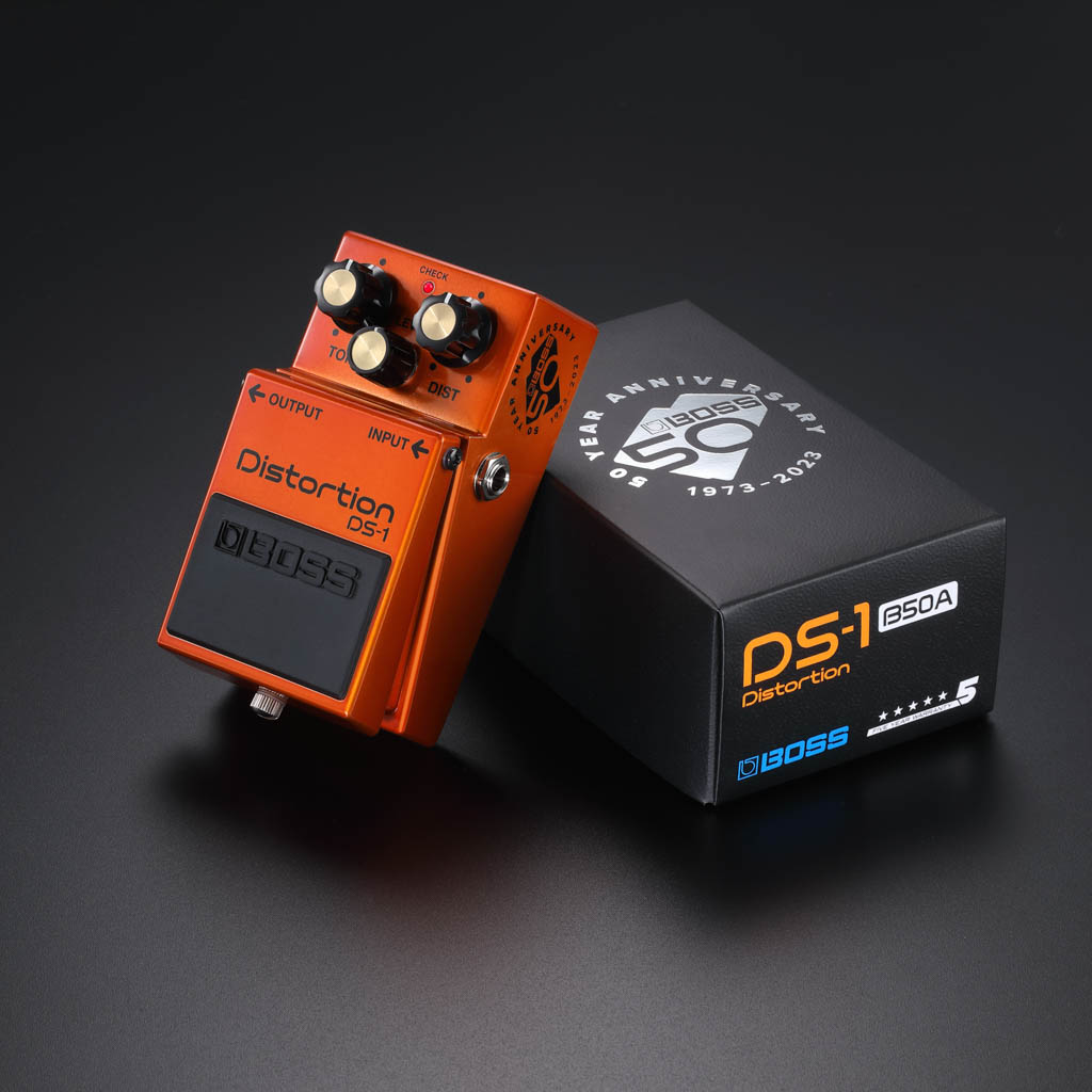2023年、BOSSブランド設立50 周年を記念し、メタリック塗装をほどこした筐体に銀ネジと金色のノブ・キャップ、記念エンブレムをあしらった特別モデルDS-1-B50A をリリースします。本体には4 桁の専用シリアルが与えられ、記念エンブレムが入ったボックスに収められています。