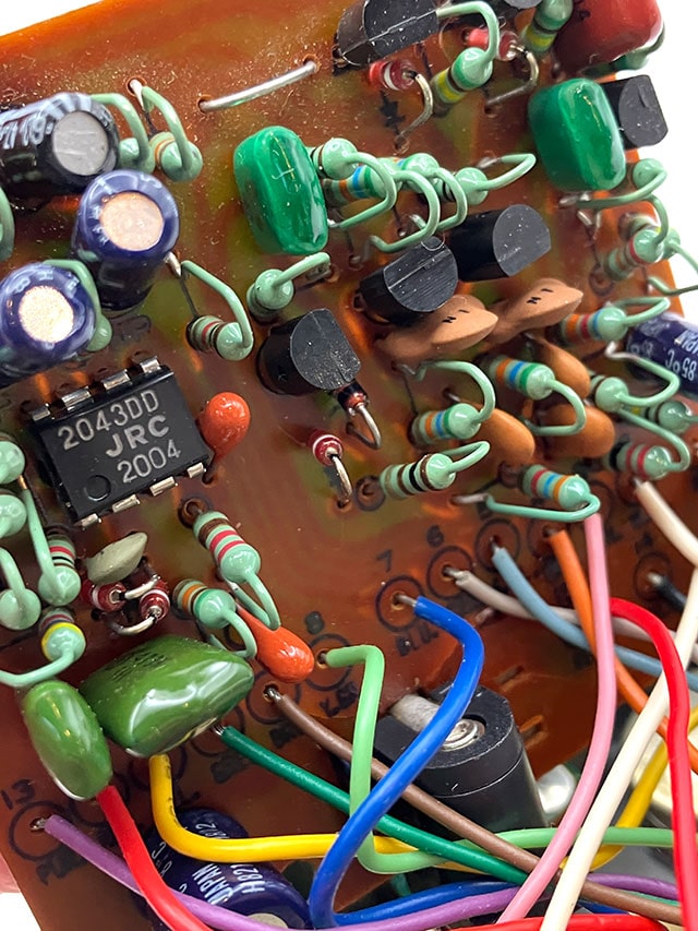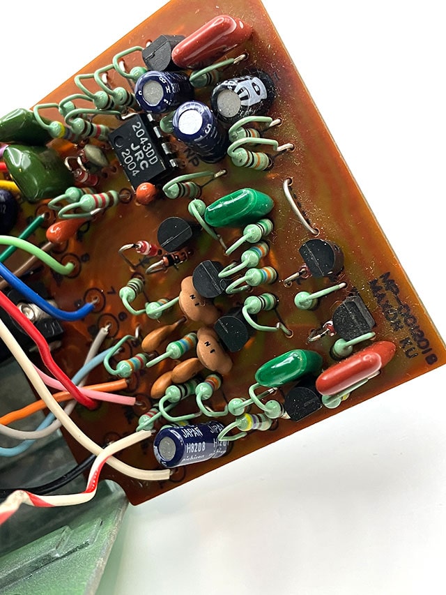 こちらの個体はシリアルNo.179787、シリアルナンバーより1981年製のものと考えられます。オペアンプにJRC2043DD、MP-DO1201B (MAXON KU) 基板搭載。筐体には多少のキズや塗装チップ、ネームプレートの凹み等がみられるものの、40年以上の時間を歩んできたにも関わらずキレイな状態でキープされている個体です。