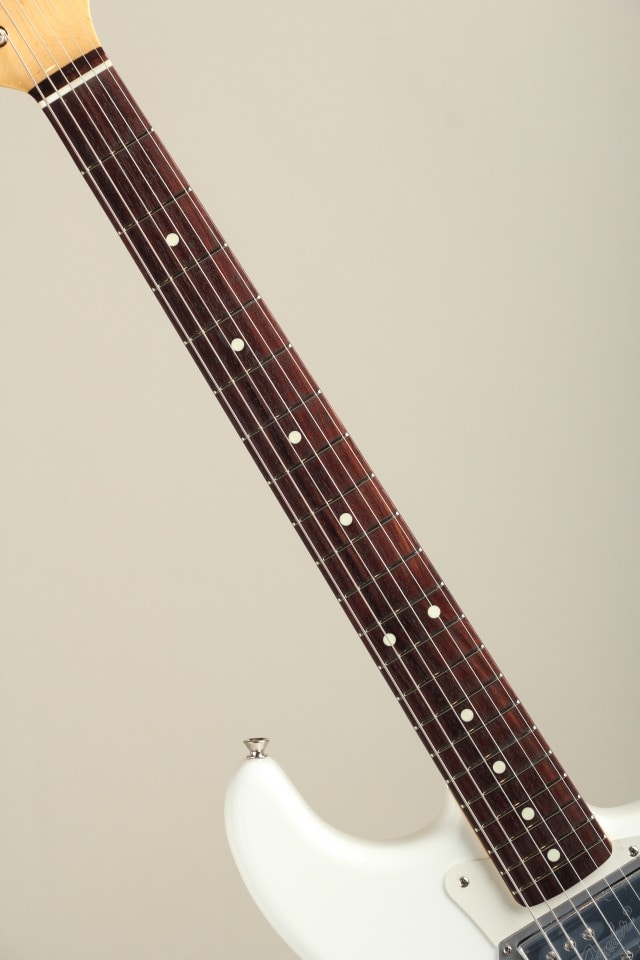 ホワイトのサテンフィニッシュを施したアッシュボディーはセンター部分を残し左右をくり抜いたシンライン構造。オリジナルのアルミ削り出しエスカッションにマウントされたCuNiFe Wide Range Humbuckerと合わせる事で太く温かい音色を生み出します。