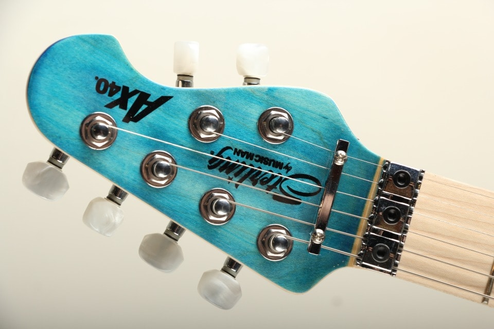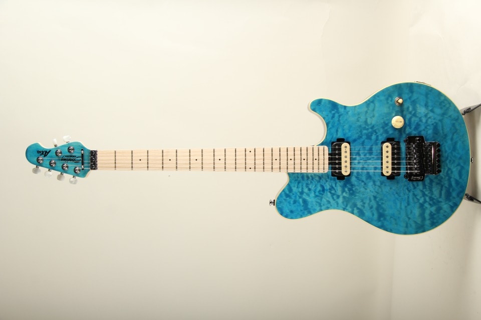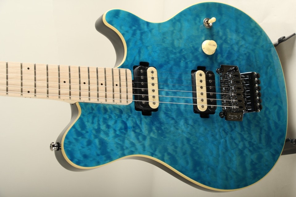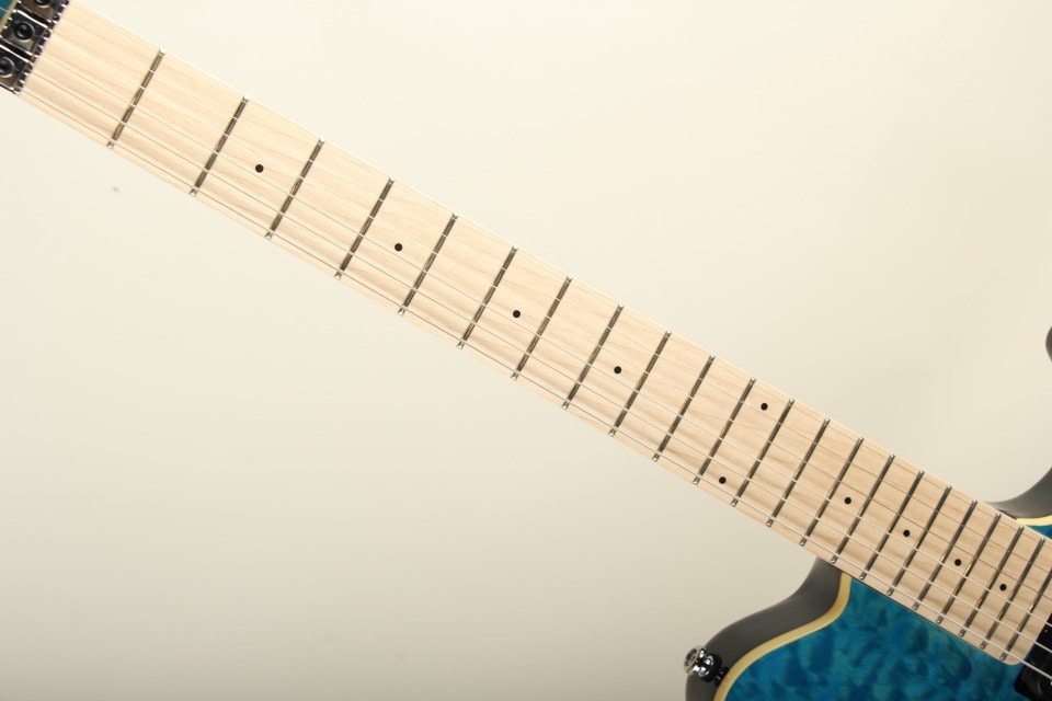本モデルとしては非常に特徴的な鮮やかな杢目がでたキルトメイプルトップ、材としてナチュラルな特徴を持つバスウッドをボディに採用、ハードメイプルが使用されたネックと指板はさらさらとしたサテン仕上げとなっており演奏時の引っかかりが無くもたつきにくくなっておりプレイアビリティを向上させるだけでなく、派手なボディデザインを際立たせるような端正な色合いのフィニッシュがされております。