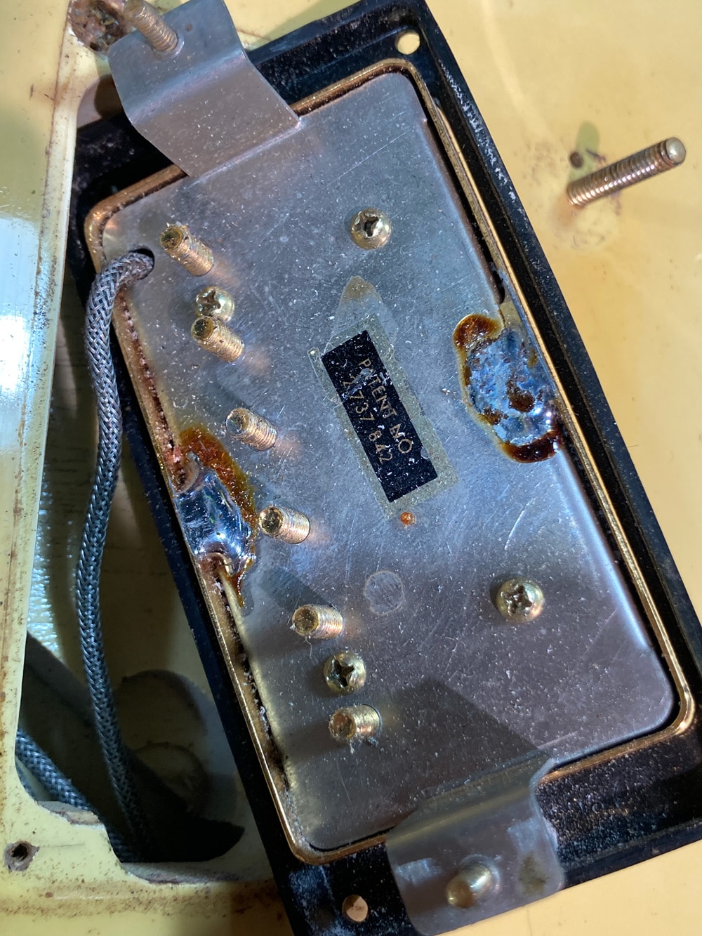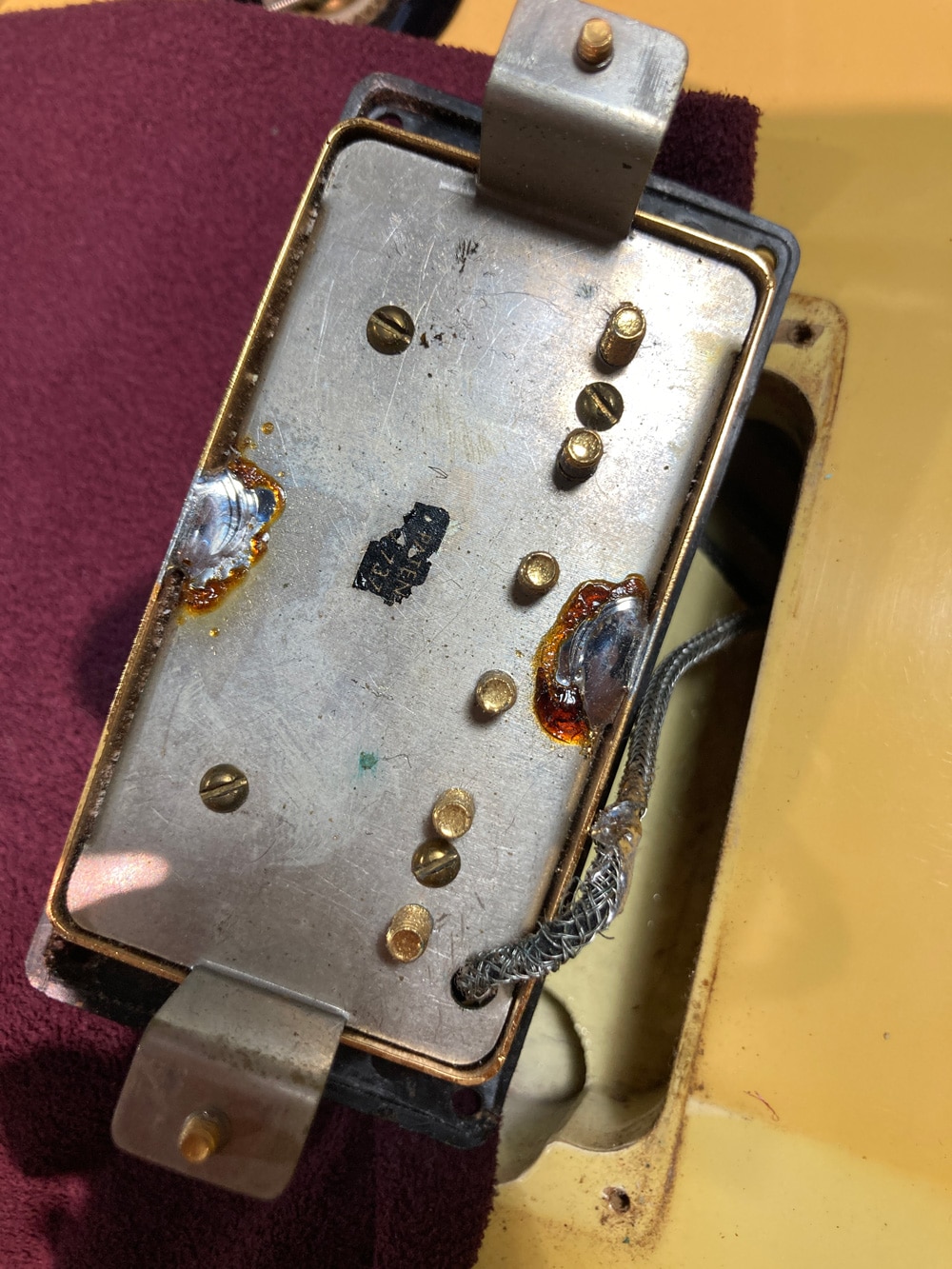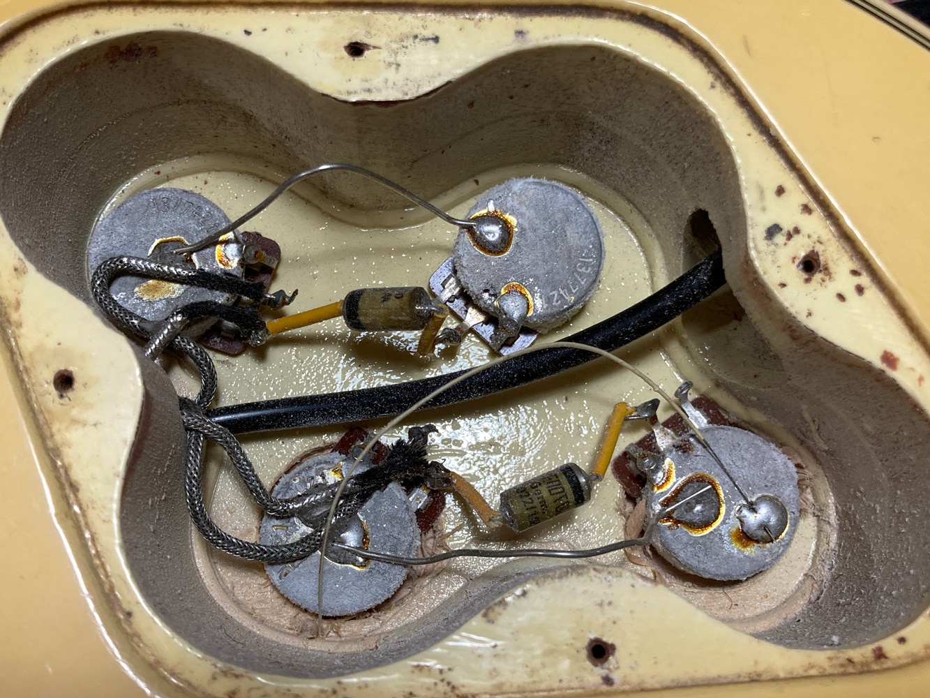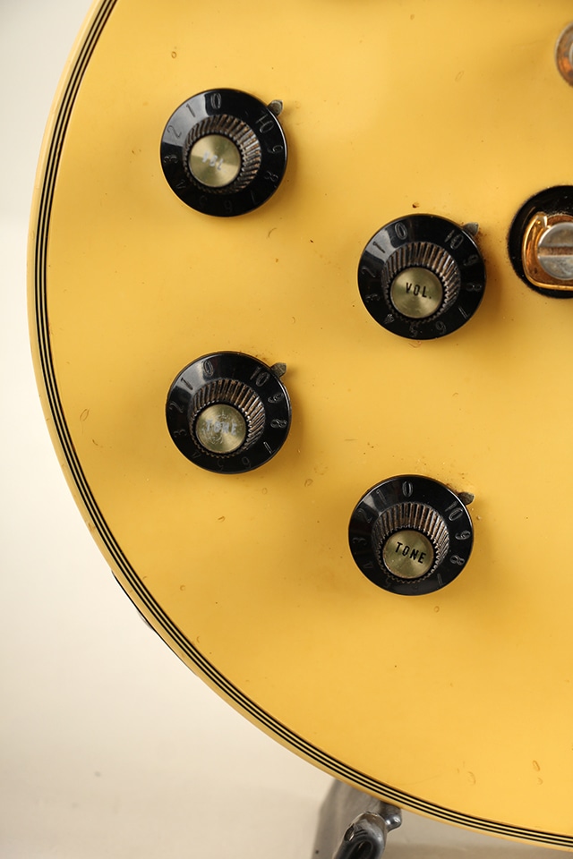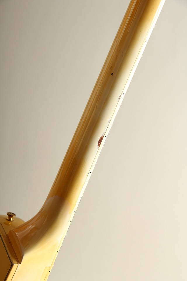 経年からある程度のキズや塗装クラック、部分的な塗装剥がれ等はありますが、年式からして良好な状態をキープしております。ブリッジサドル2つ、ペグはグローバーからこの年代のワッフルペグへ交換。ブリッジ下にエクストラホール2つ有り、ボディエンド側にストラップピン穴埋め痕1つ有り。ネックコンディションは良好でトラスロッド余裕もあり、リナット&リフレットされて残りもありますので演奏面も良好です。オリジナルハードケースが付属します。