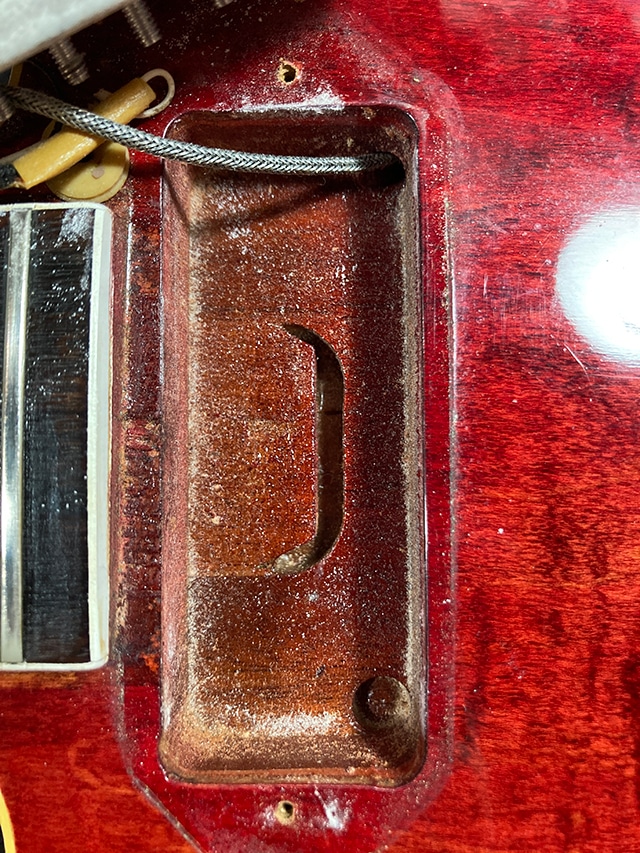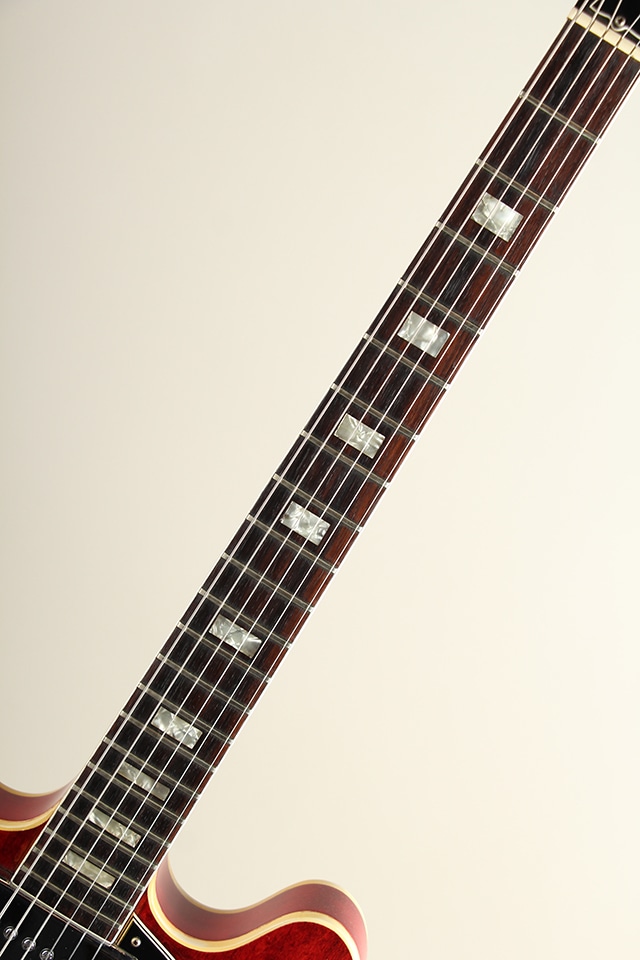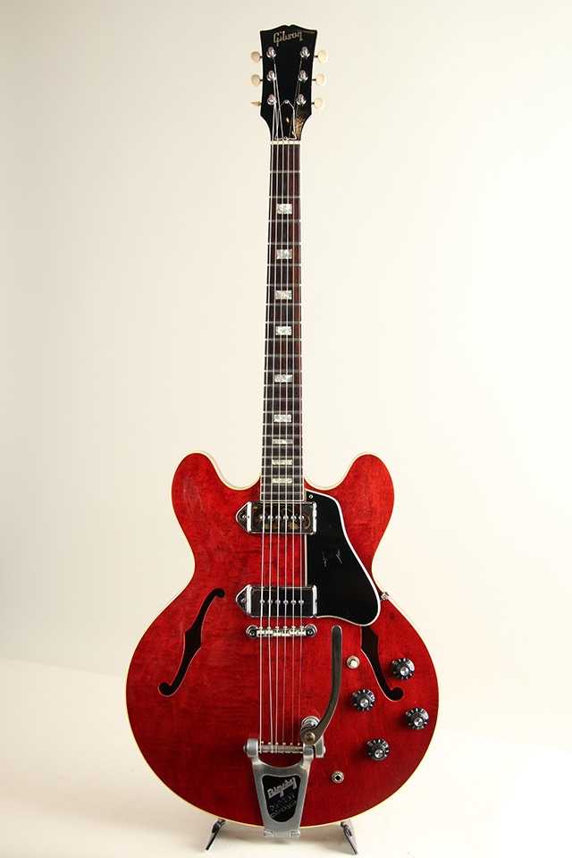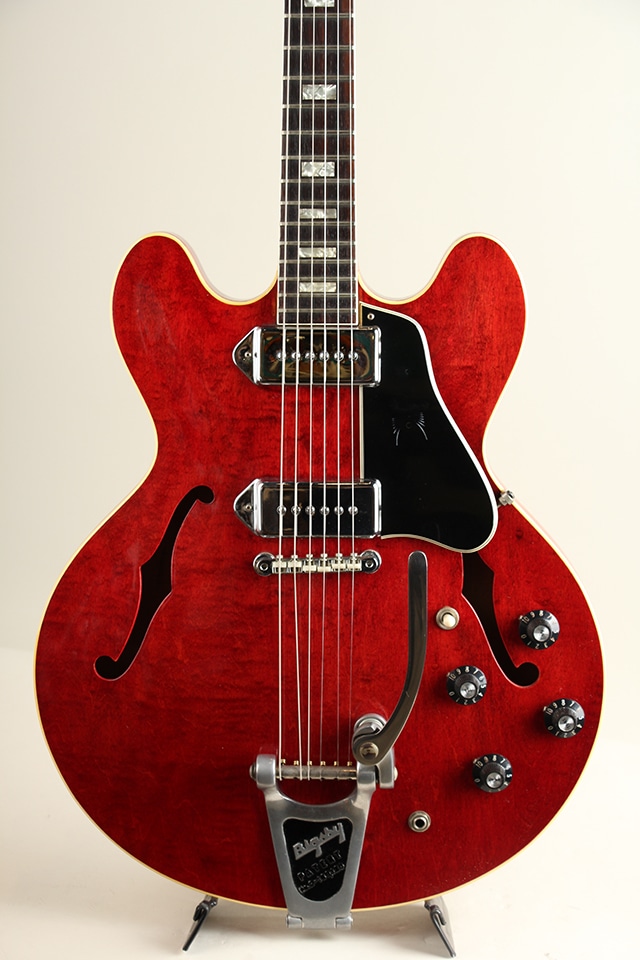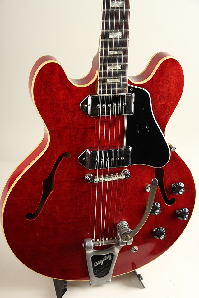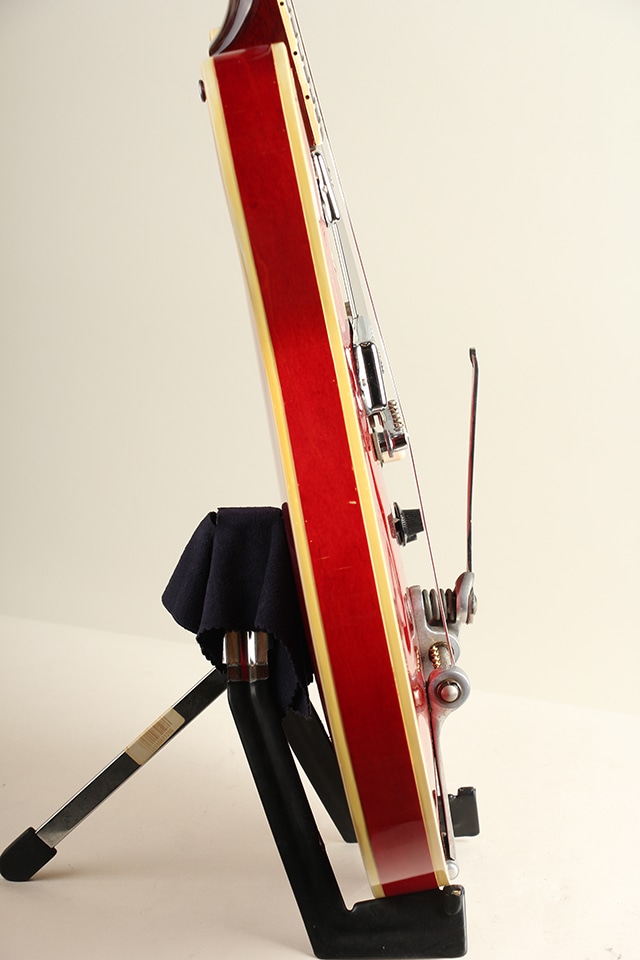 完全ホロウ構造にP-90の組み合わせは50sギブソンのフルアコES-125やES-175などでおなじみで実に素直なトーン。抜群の生鳴りから生まれるサウンドは、ホロウ構造ながら非常に素早く立ち上がり、タッチに対してのレスポンスも申し分ありません。当機は元々のブランコ・テールピースからBigsby B3に交換、Bigsby自体は同年代の物で自然な風合いです。67年シリアルに67年ポットデイト。