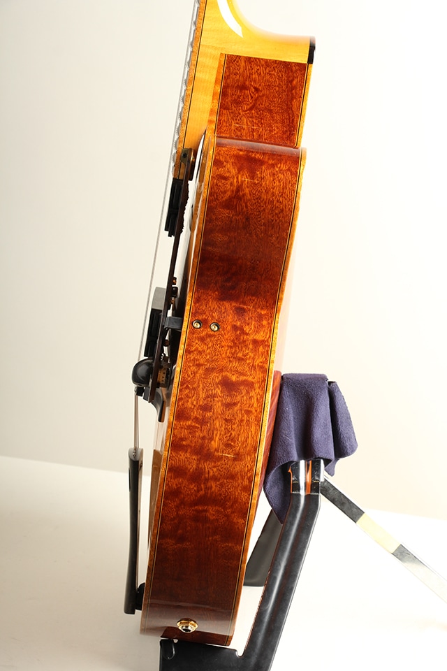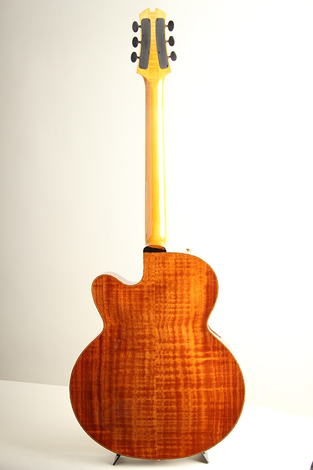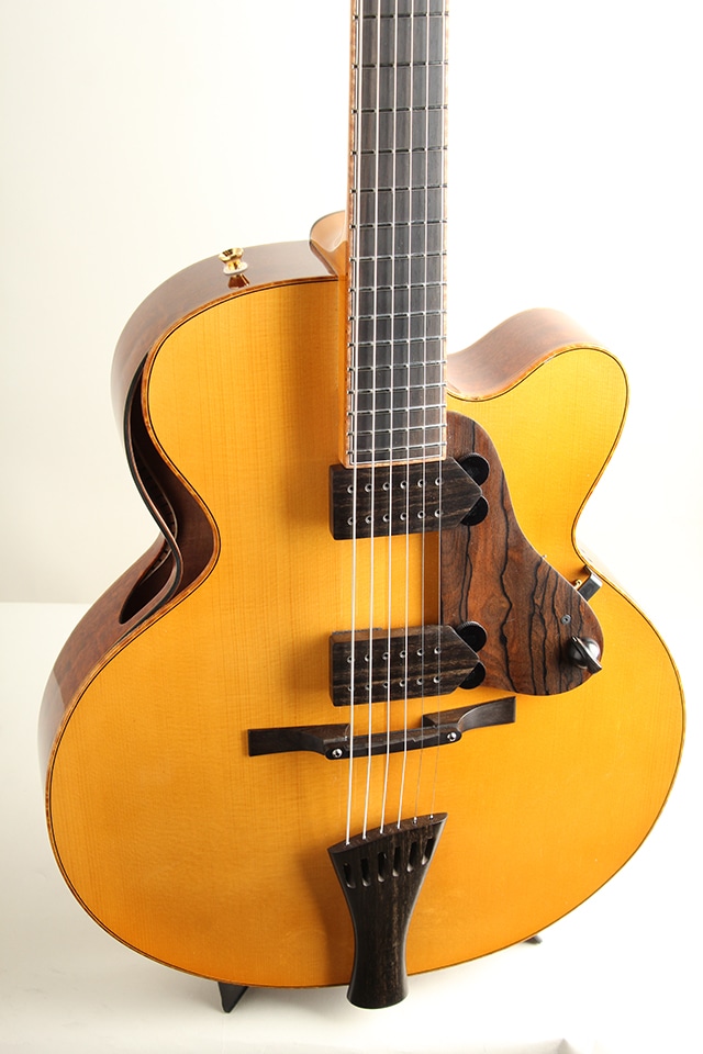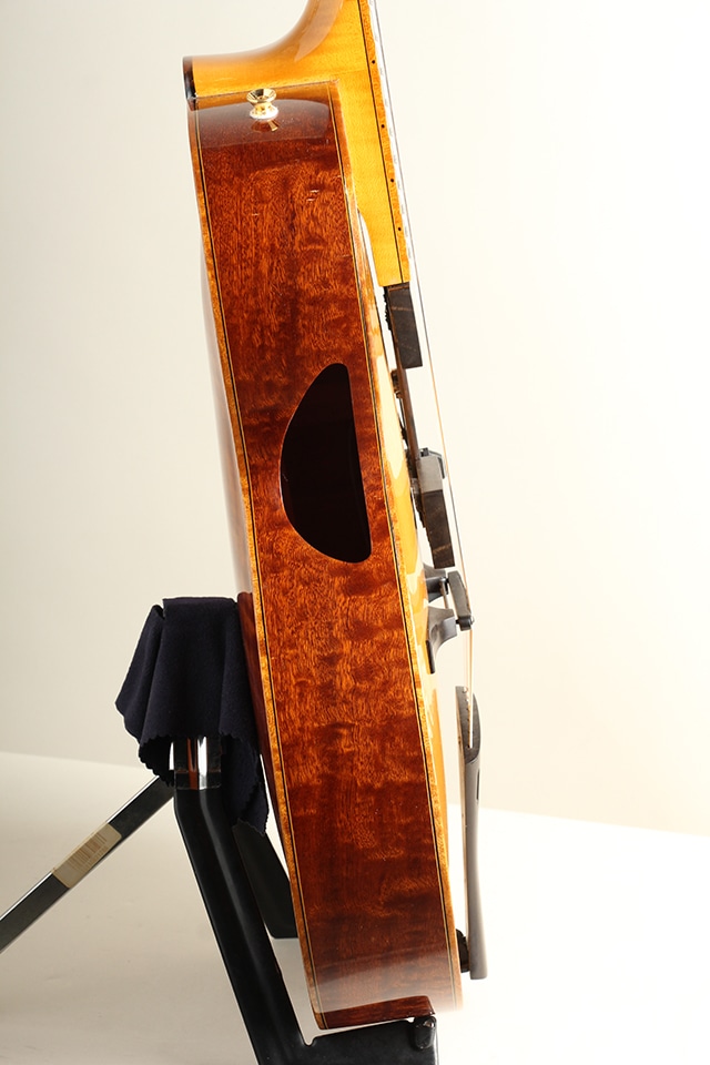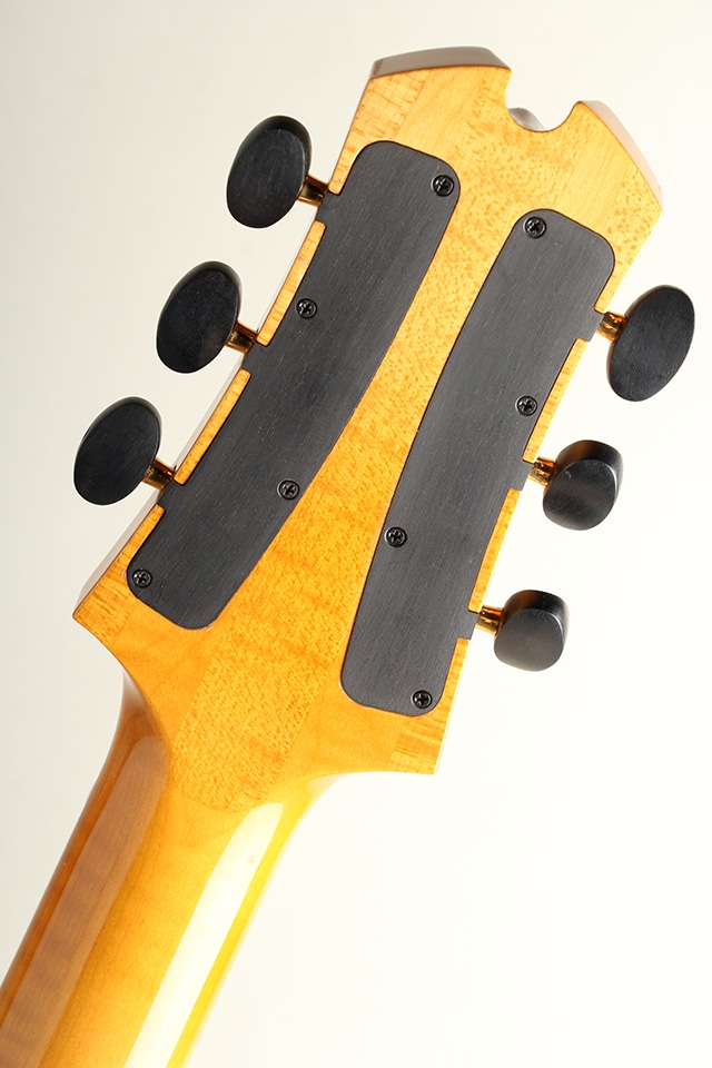 「100% アコースティック、100% エレクトリック」とのコンセプトが設けられた当モデルは、特徴的なサイドポートとサウンドボックスが大きく設けられたオリジナルシェイプとなっております。トップとバックは手彫りで、100%アコースティックのコンセプト通り、板材が非常に薄いため、反応や音量感も含めて非常にアコースティック感の強い上質の鳴りを実現しており、重量も約2.13kgとフルアコとしては驚異の軽量で仕上げられております。