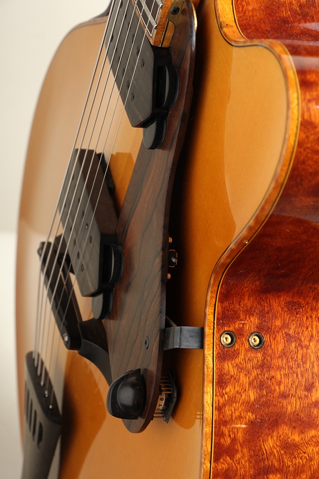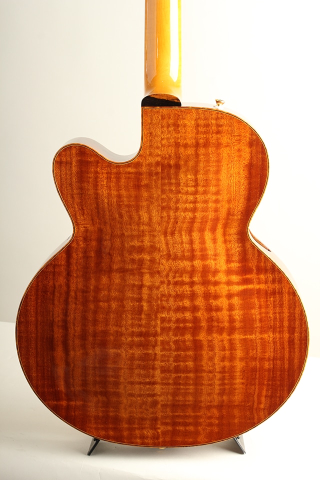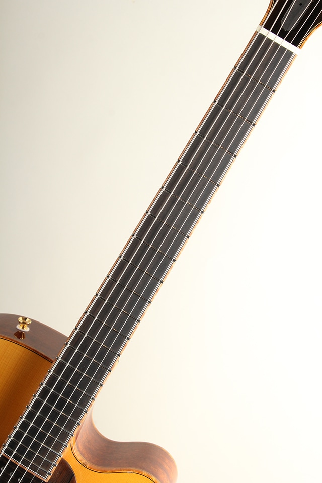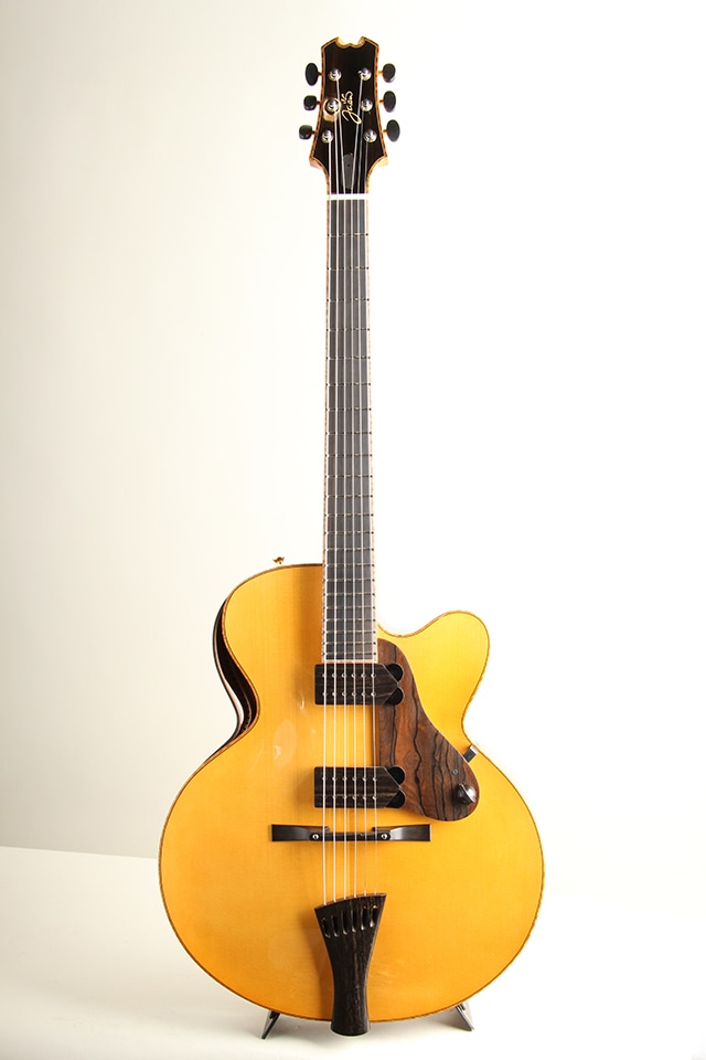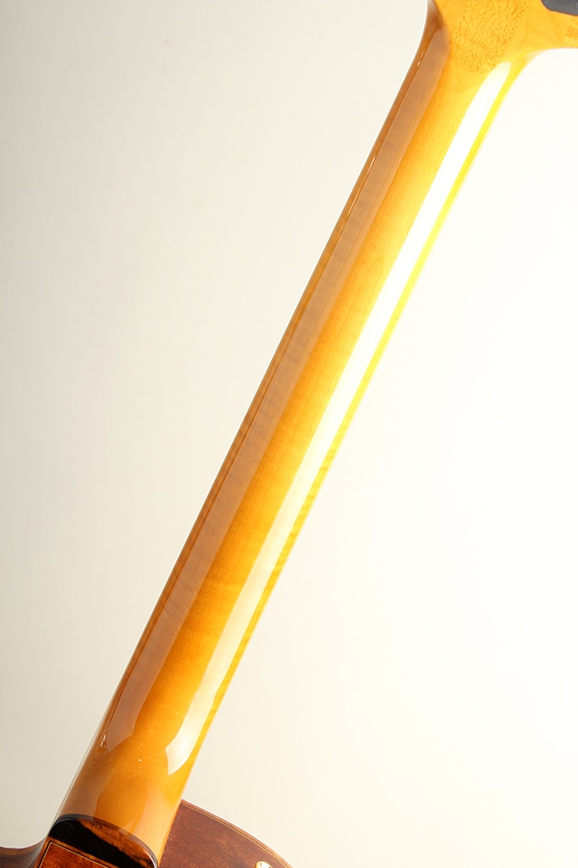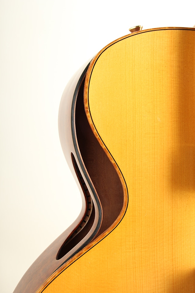 「100% アコースティック、100% エレクトリック」とのコンセプトが設けられた当モデルは、特徴的なサイドポートとサウンドボックスが大きく設けられたオリジナルシェイプとなっております。トップとバックは手彫りで、100%アコースティックのコンセプト通り、板材が非常に薄いため、反応や音量感も含めて非常にアコースティック感の強い上質の鳴りを実現しており、重量も約2.13kgとフルアコとしては驚異の軽量で仕上げられております。