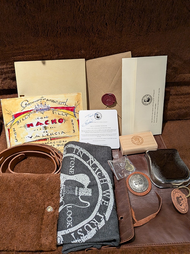 ツィードハードケースの他、オリジナルストラップ、50年代当時のFender資料のコピー、スペック等が封入された未開封のレター、オリジナル・レザーバック、ブリッジプレート、当機の画像データが入ったUSBとUSB用の木箱も付属します。