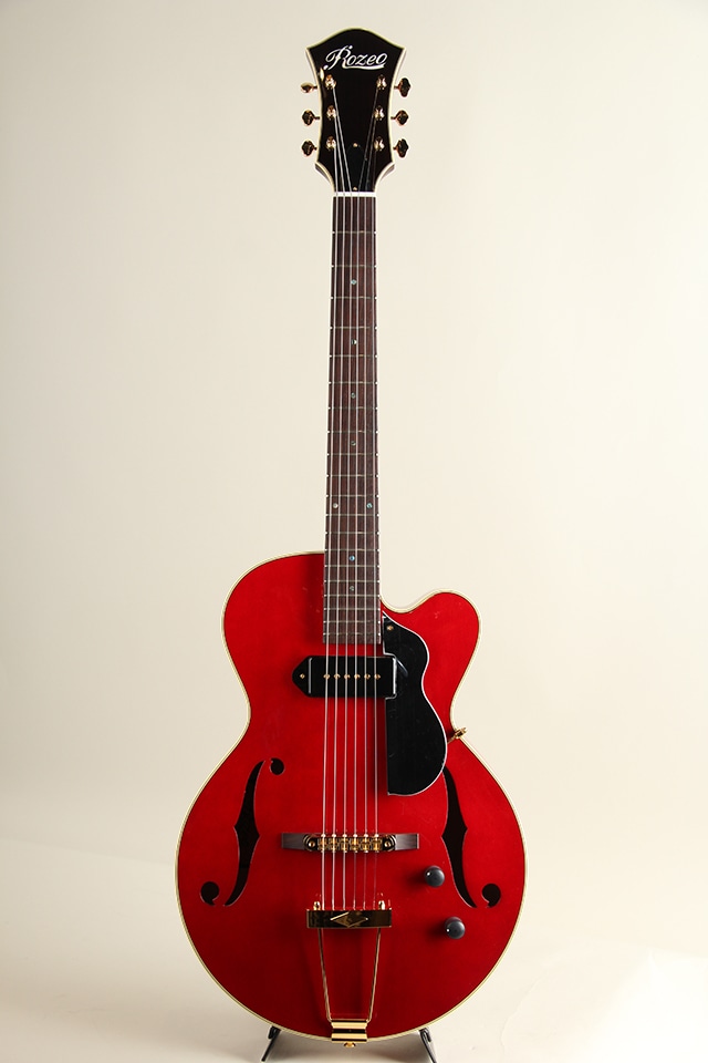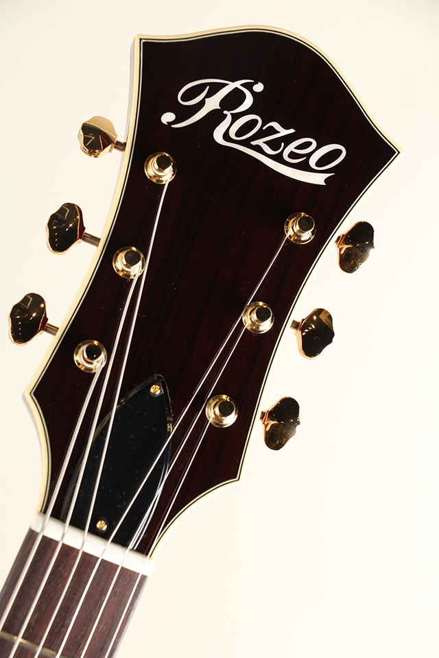 そんな寺田楽器のプロジェクト”Terada One Products”。現場の若き職人による設計、企画を具現化する意欲的なプロジェクトです。こちらは気鋭の職人”樋口 恭大(ヒグチ キョウダイ)”氏の設計、企画によるブランド”Rozeo”のコンパクトモデル”Ladybug。14インチの小振りなボディ、そして氏によるオリジナルデザインのfホールが、どことなくレトロな雰囲気の良い小型フルアコです。「小粋なブルースマンがさりげなく爪弾くイメージで設計しましたが、完成してみると案外ソロギターやジャズ系フレーズにも合う楽器に仕上がりました(樋口氏)」という言葉のとおり、サイズからは想像出来ない程のバランスの良い豊かな音色を聞かせてくれ、心地よい音量感や音の深み等、純粋に演奏することの楽しさを思い起こさせてくれる楽器です。