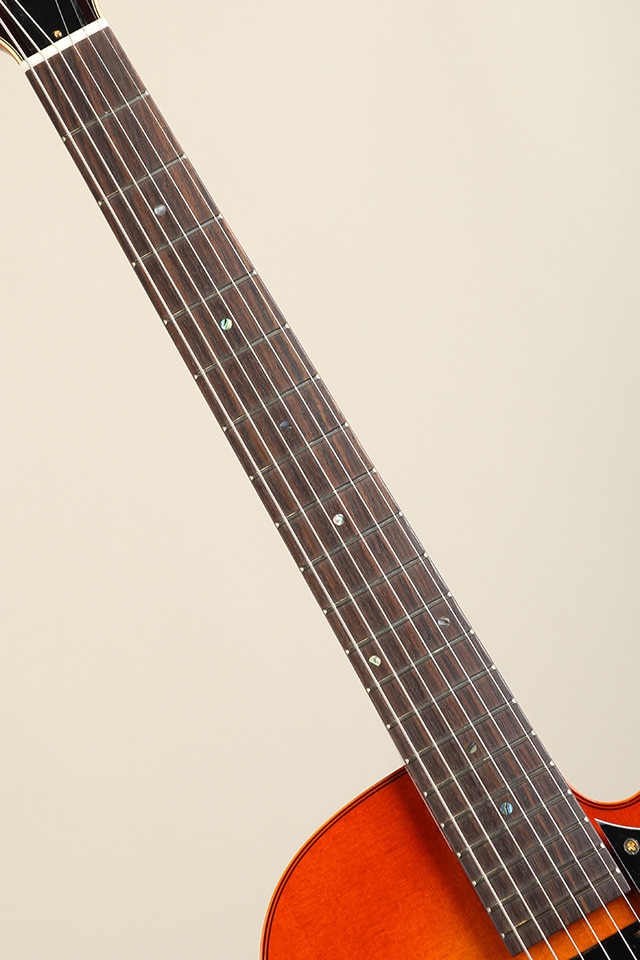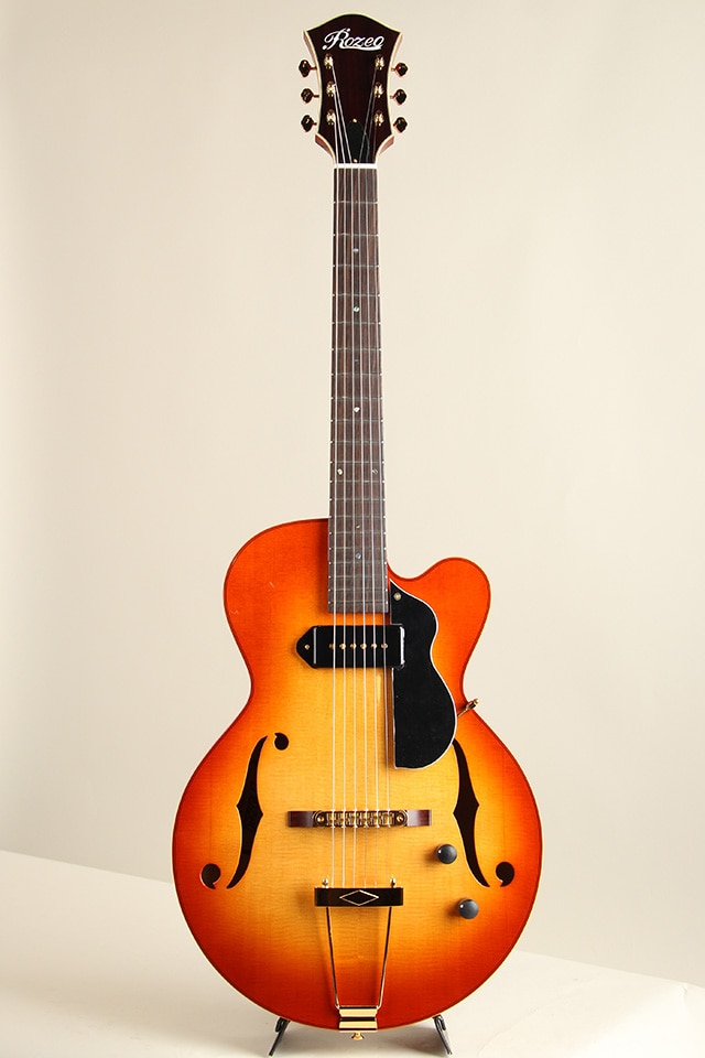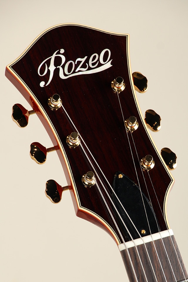 そんな寺田楽器のプロジェクト”Terada One Products”。現場の若き職人による設計、企画を具現化する意欲的なプロジェクトです。こちらは気鋭の職人”樋口 恭大(ヒグチ キョウダイ)”氏の設計、企画によるブランド”Rozeo”のコンパクトモデル”Ladybug。14インチの小振りなボディ、そして氏によるオリジナルデザインのfホールが、どことなくレトロな雰囲気の良い小型フルアコです。「小粋なブルースマンがさりげなく爪弾くイメージで設計しましたが、完成してみると案外ソロギターやジャズ系フレーズにも合う楽器に仕上がりました(樋口氏)」という言葉のとおり、サイズからは想像出来ない程のバランスの良い豊かな音色を聞かせてくれ、心地よい音量感や音の深み等、純粋に演奏することの楽しさを思い起こさせてくれる楽器です。