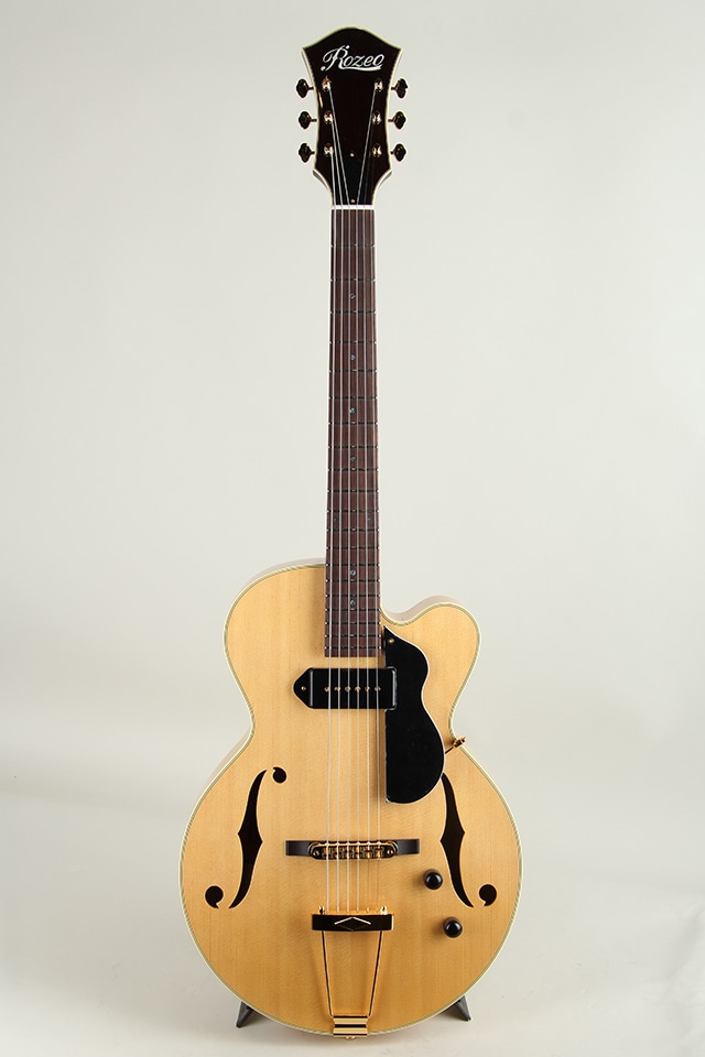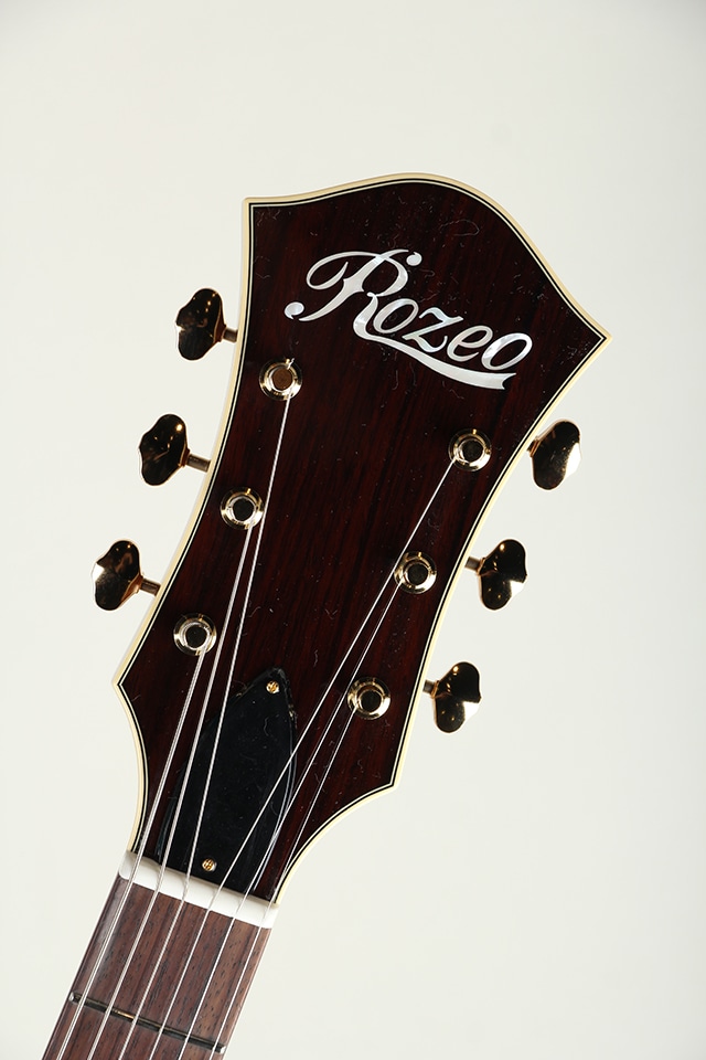 そんな寺田楽器のプロジェクト”Terada One Products”。現場の若き職人による設計、企画を具現化する意欲的なプロジェクトです。こちらは気鋭の職人”樋口 恭大(ヒグチ キョウダイ)”氏の設計、企画によるブランド”Rozeo”のコンパクトモデル”Ladybug。14インチの小振りなボディ、そして氏によるオリジナルデザインのfホールが、どことなくレトロな雰囲気の良い小型フルアコです。「小粋なブルースマンがさりげなく爪弾くイメージで設計しましたが、完成してみると案外ソロギターやジャズ系フレーズにも合う楽器に仕上がりました(樋口氏)」という言葉のとおり、サイズからは想像出来ない程のバランスの良い豊かな音色を聞かせてくれ、心地よい音量感や音の深み等、純粋に演奏することの楽しさを思い起こさせてくれる楽器です。