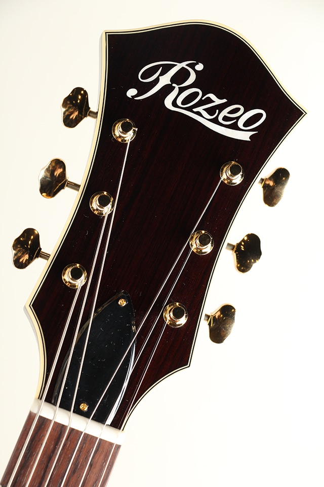 そんな寺田楽器のプロジェクト”Terada One Products”。現場の若き職人による設計、企画を具現化する意欲的なプロジェクトです。こちらは気鋭の職人”樋口 恭大(ヒグチ キョウダイ)”氏の設計、企画によるブランド”Rozeo”のコンパクトモデル”Ladybug。14インチの小振りなボディ、そして氏によるオリジナルデザインのfホールが、どことなくレトロな雰囲気の良い小型フルアコです。「小粋なブルースマンがさりげなく爪弾くイメージで設計しましたが、完成してみると案外ソロギターやジャズ系フレーズにも合う楽器に仕上がりました(樋口氏)」という言葉のとおり、サイズからは想像出来ない程のバランスの良い豊かな音色を聞かせてくれ、心地よい音量感や音の深み等、純粋に演奏することの楽しさを思い起こさせてくれる楽器です。