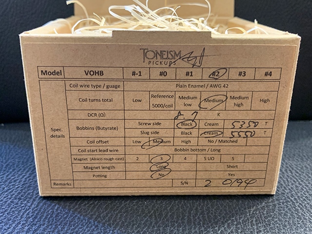 当モデルVOHB #1は、王道の50's 仕様を追求したリア搭載を前提としたタイプで、フロントとのバランス、ポジションによるトーンの違いを考えて抜け感、分離の良さとクリーミーさを調整をしています。ややゲインを上げ歪みとの相性も考慮されたリア向き、当店販売のVOHB #1 Zebra S/N:2 0193とのセットもお勧めです。