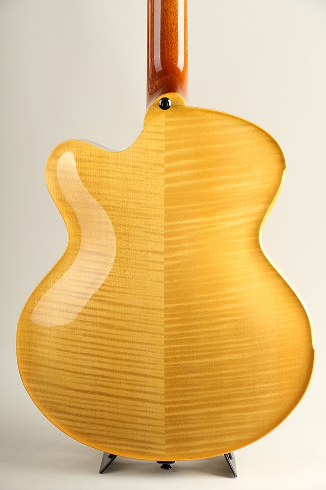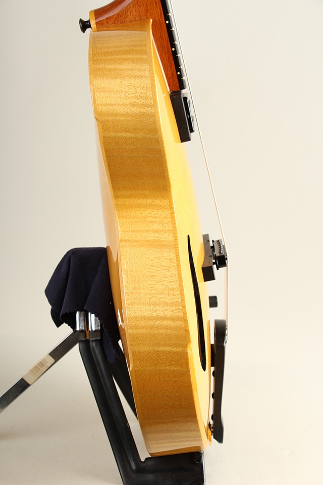 当機はVictor Bakerで最もポピュラーといえるフルホロー15インチモデルをベースに、ボディサイドとバック材にフレイムメイプルを指定した当店オーダーモデルです。