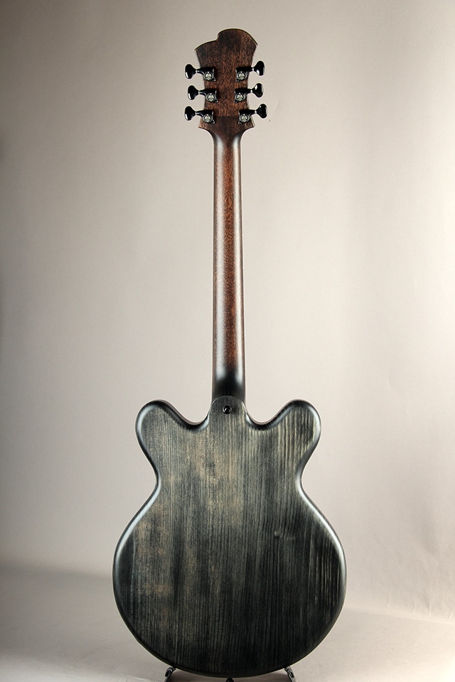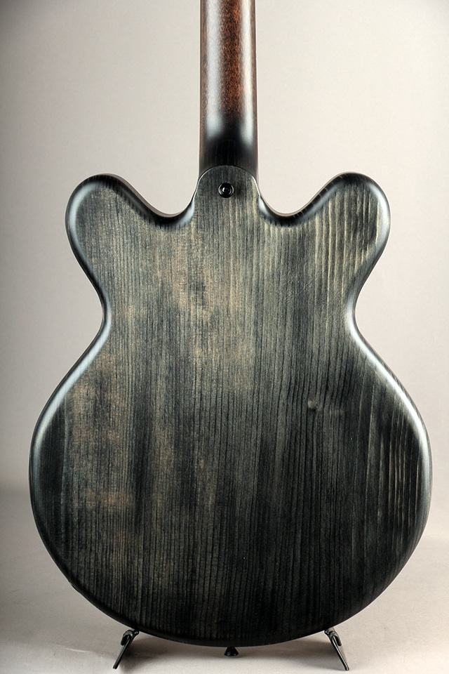 当機はチェンバーセミホロー構造の採用した15インチモデル。ES-335よりも1インチ小振りなボディサイズで、ボディサイドバックはくり抜き構造で、リアPU下にはセンターブロックも無く、ホロー構造領域の多い豊かな生鳴りと軽量なウェイトを実現した設計となっております。