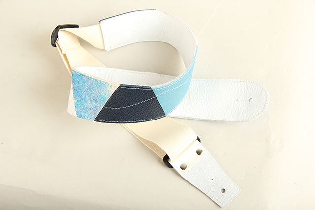 ギターに付けて演奏しているときは、角度によって印象が変わるのも楽しみのひとつ!1つのストラップなのにいろんな表情を魅せてくれるのが、このパッチワークストラップの魅力です。さらに、柔らかな触り心地のレザーが裏側にも使用されておりこのストラップの魅力をUPさせています。
