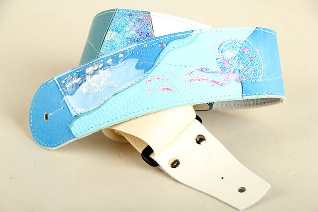 より海の雰囲気が出したい!と特別デザインが盛り込まれたスペシャルエディション!海をイメージしたレザーの上にクリア素材を被せ、その中に宝石のようなスパンコールが贅沢に散りばめられた素晴らしいアイディアの詰まった1本。キラキラと海面が揺らぐイメージで仕上げられた涼しげなデザインで、レザーはブルー系、ホワイト系、ブルー系アートを採用し海を表現。刺繍デザインのクラゲも、このレザーに合わせた特別な色合いに。ステッチや剣先のレザーはホワイトを用いて淡い仕上げに。