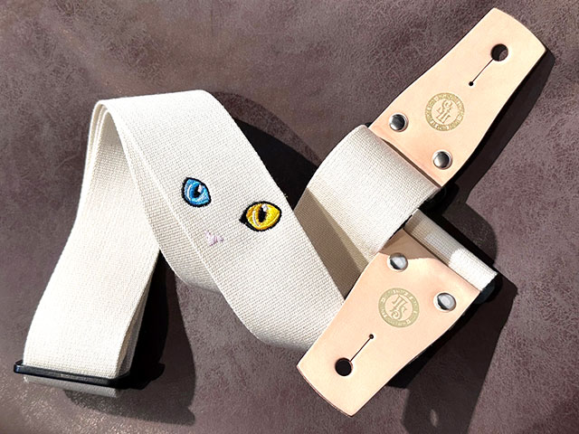 ストラップ本体の素材には柔らかくて肩への馴染みの良いアクリル製を使用し、ベルト調整のバックル部分にはギターを傷つけにくいプラスティックパーツのものを採用しております。