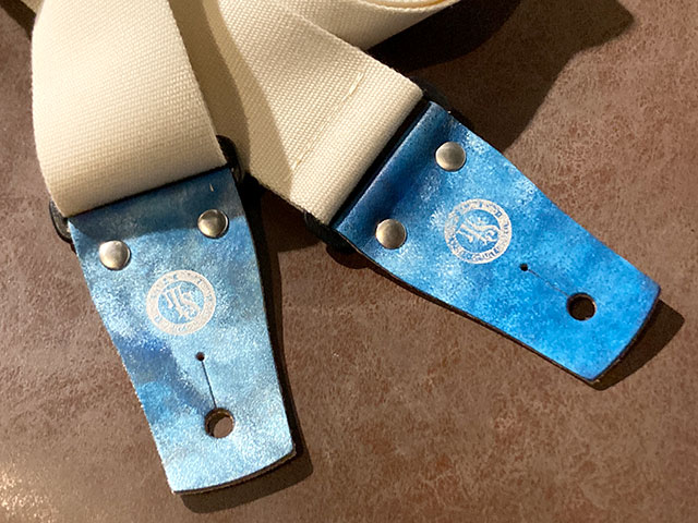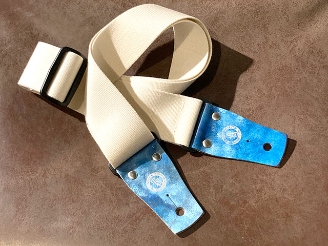 オフホワイトの柔らかなストラップ生地に美しいブルーマーブルペイントデザインが映える1本。剣先の革はしっかりとした本革を使う事により、強度もあります。