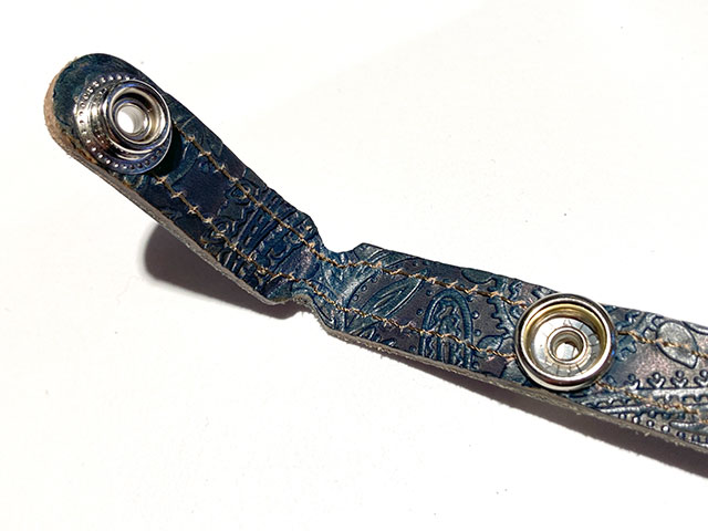 大阪に実店舗を構えるギター・ベースストラップ専門店 Grande uomo 製作の本革レザーストラップタイ。 ギタリストで革職人である職人さんが全て手作業で製作されているため、ストラップのことも楽器のことも熟知しているからこそできる、みんなが求める仕様のアコギ用のストラップアタッチメント、Grande uomoストラップタイが完成。 大事なギター本体にストラップピンを取り付けるのは避けたい、でも次のライブで立って演奏しなくちゃいけない... 座って弾くけどストラップ付けて演奏したい! すごくお気に入りのストラップを見つけたけど、よく考えたら自分のギターはストラップピンが1つしか付いてませんでした... そんなときに必要になるのがストラップアタッチメントなのですが、紐状のものは解けて外れる危険性があるし、よくある市販のものは、自分のレザーストラップには似合わないんです...なんて悩んだ経験ありませんか? 大事なギターもストラップをキズつけることなく、尚且つおしゃれに魅せる仕上がりに。ストラップに使用されている高級レザーをそのまま使用されている贅沢なアイテムとなっています!通常のストラップにそのまま加工無しで装着可能です。 取り付け方法 ①正面左側の短い輪っか部分がストラップ側になります。 折り目部分が細くなっていますので、ここにストラップ穴を通します。 ②正面右側ペイズリー側長い輪っか部分がアコギのネックに通す側になります。 ボタンを外して弦の内側にこのストラップタイを通し、ボタンをはめ直して下さい。 取り付けイメージは写真にてご確認ください。 ※画像はサンプルです。革は天然皮革の為、素材の特性上、キズや擦れ、シワなどがございます。ご理解いただきました上ご購入くださいませ。 ※画像はサンプルです。ハンドメイド製品のため、1つ1つ刺繍やレザーの風合いが異なる場合がございます。予めご了承くださいませ。