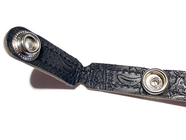 大阪に実店舗を構えるギター・ベースストラップ専門店 Grande uomo 製作の本革レザーストラップタイ。 ギタリストで革職人である職人さんが全て手作業で製作されているため、ストラップのことも楽器のことも熟知しているからこそできる、みんなが求める仕様のアコギ用のストラップアタッチメント、Grande uomoストラップタイが完成。 大事なギター本体にストラップピンを取り付けるのは避けたい、でも次のライブで立って演奏しなくちゃいけない... 座って弾くけどストラップ付けて演奏したい! すごくお気に入りのストラップを見つけたけど、よく考えたら自分のギターはストラップピンが1つしか付いてませんでした... そんなときに必要になるのがストラップアタッチメントなのですが、紐状のものは解けて外れる危険性があるし、よくある市販のものは、自分のレザーストラップには似合わないんです...なんて悩んだ経験ありませんか? 大事なギターもストラップをキズつけることなく、尚且つおしゃれに魅せる仕上がりに。ストラップに使用されている高級レザーをそのまま使用されている贅沢なアイテムとなっています!通常のストラップにそのまま加工無しで装着可能です。 取り付け方法 ①正面左側の短い輪っか部分がストラップ側になります。 折り目部分が細くなっていますので、ここにストラップ穴を通します。 ②正面右側ペイズリー側長い輪っか部分がアコギのネックに通す側になります。 ボタンを外して弦の内側にこのストラップタイを通し、ボタンをはめ直して下さい。 取り付けイメージは写真にてご確認ください。 ※画像はサンプルです。革は天然皮革の為、素材の特性上、キズや擦れ、シワなどがございます。ご理解いただきました上ご購入くださいませ。 ※画像はサンプルです。ハンドメイド製品のため、1つ1つ刺繍やレザーの風合いが異なる場合がございます。予めご了承くださいませ。