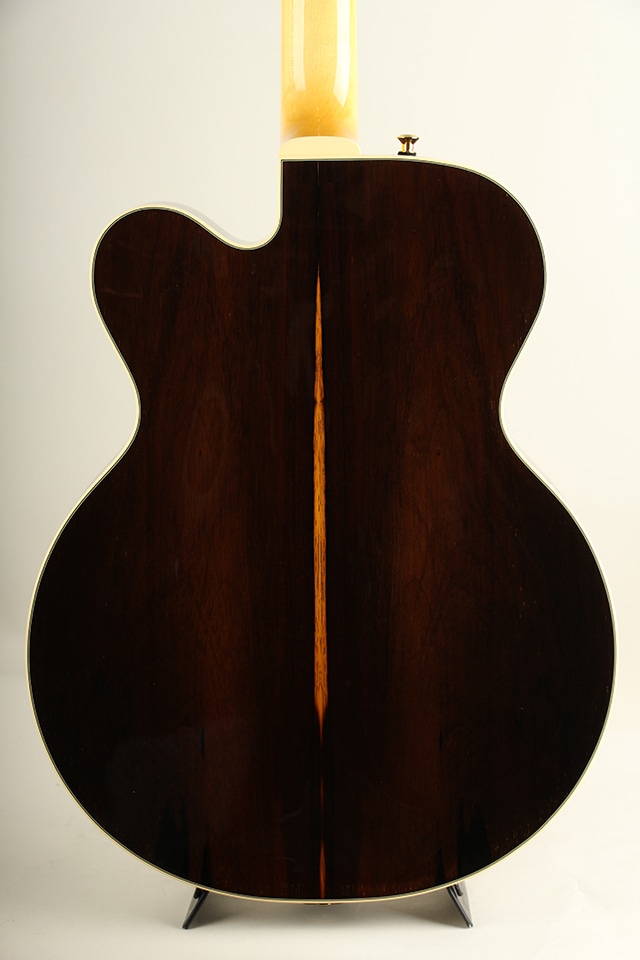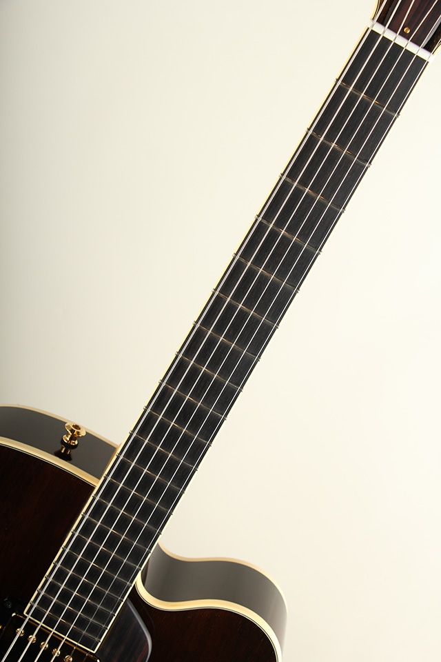 やや薄胴の16インチサイズ。ラミネイトハカランダ・ボディ、エボニー指板、ブリッジ&テールピース、24 3/4インチスケール、やや幅広で薄い弾きやすいネック等、シンプルで洗練されたデザインの中に細部まで拘りぬいて製作された精度の高さを感じさせてくれる仕上がりです。