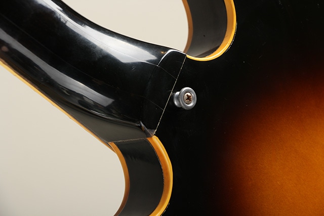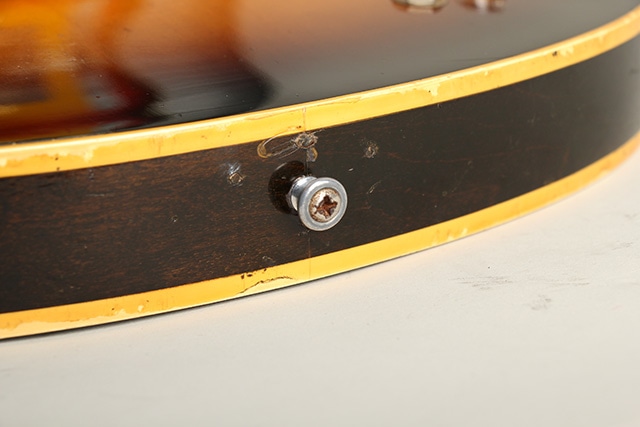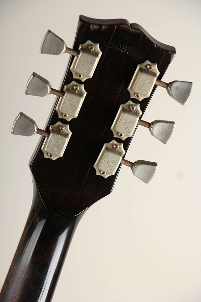 こちらテイルピースがストップテイルピースに交換の他ナット、フレット、コントロールノブが交換。ネックの塗装剥がれや白濁等年式相応の使用感はございますがネックコンディションも良好でトラスロッド余裕もございます。フレットも残っており演奏面も良好です。