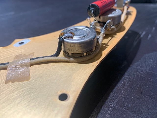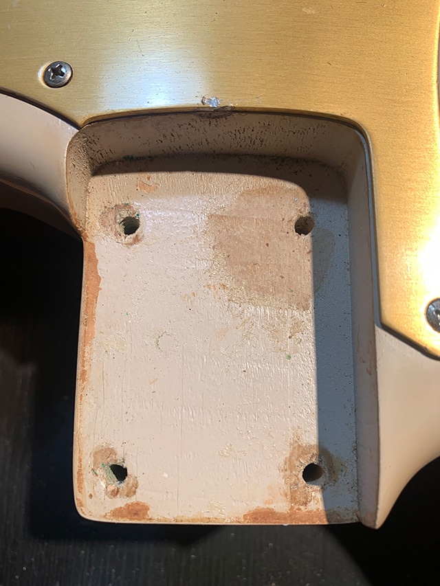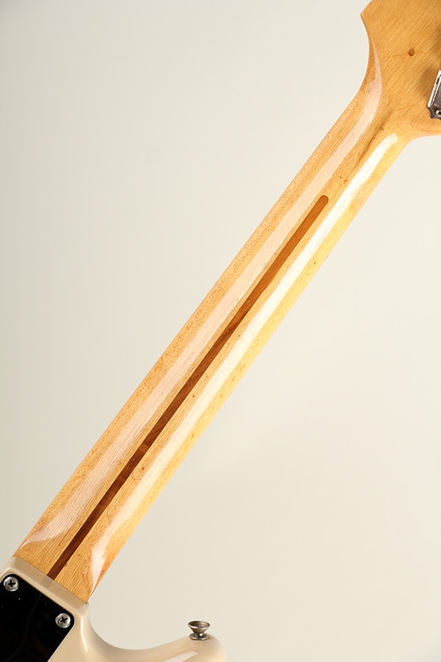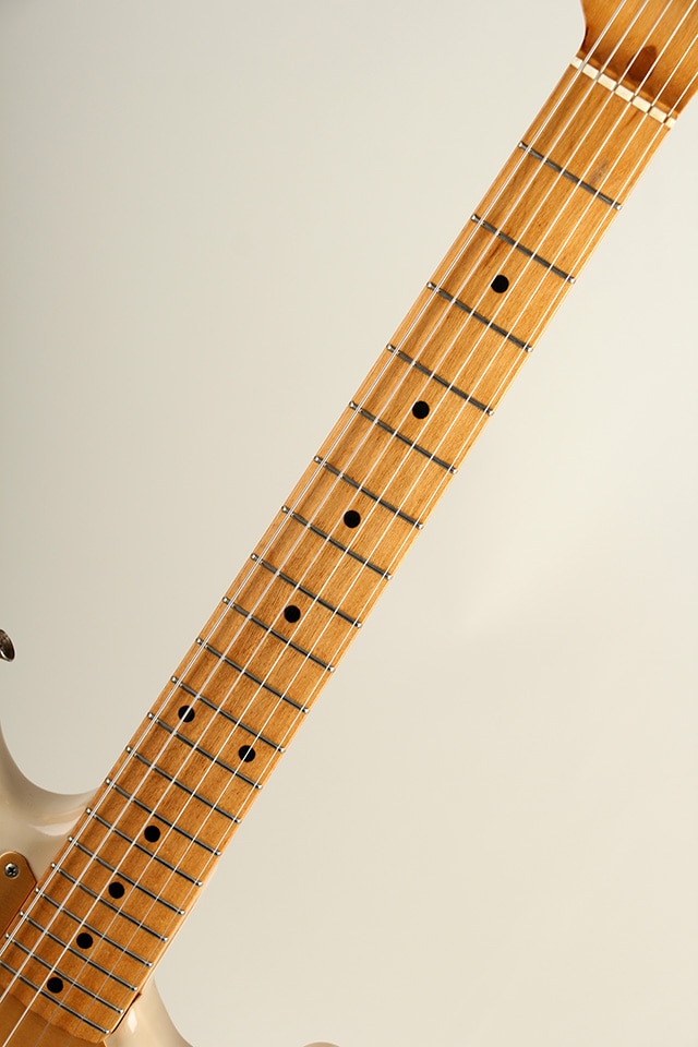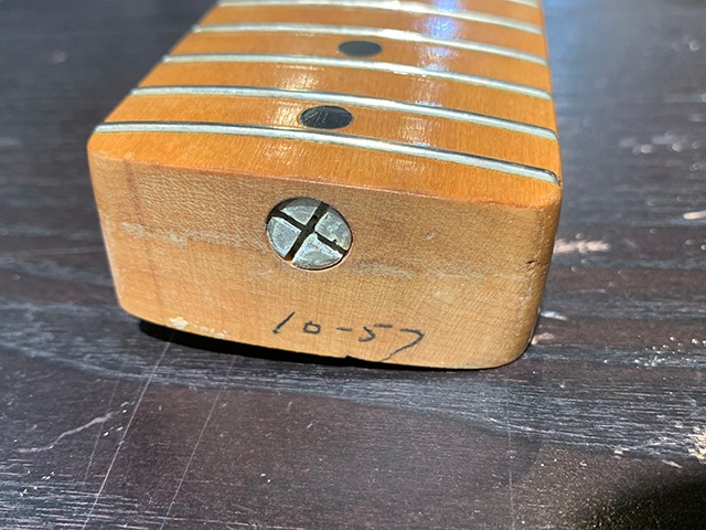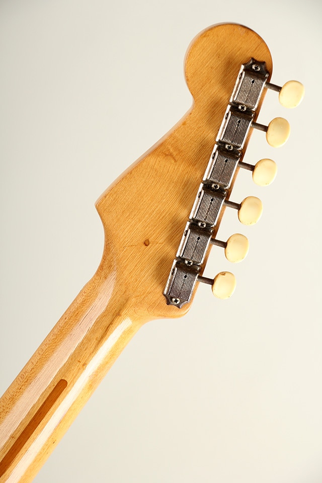 ワイドな約42mmのナット幅にこの年代ならではのVシェイプが特徴のメイプル1ピースネック、アノダイズド・ピックガード期の1957年製です。