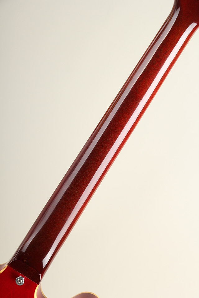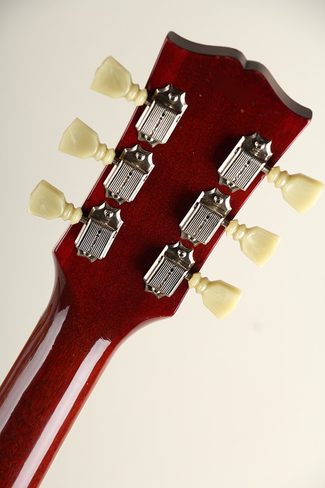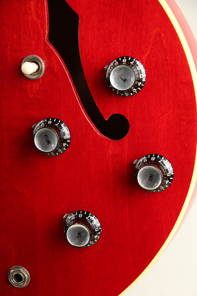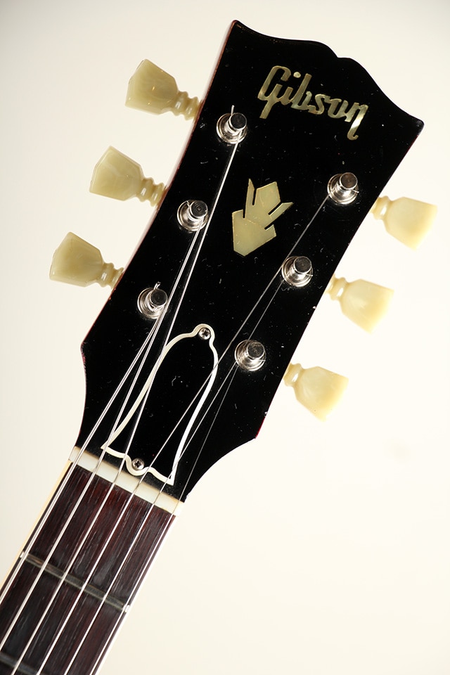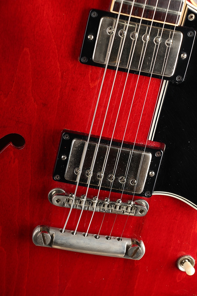 塗装の艶もしっかり残っておりチェリーのフェイドも少なく、年式からしてとてもクリーンな状態をキープしています。ボディトップ(エルボ部)一部に少しのオーバーラッカー有、テールピース、ブリッジサドル1つが交換。ネックコンディションも良好でトラスロッド余裕有、フレット残りもあり演奏面も良好です。オリジナルハードケースが付属します。