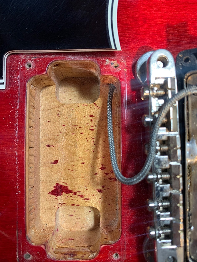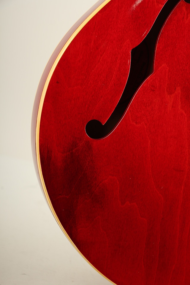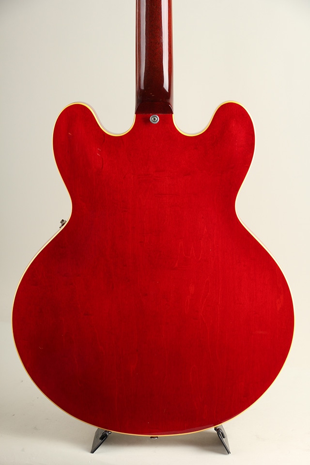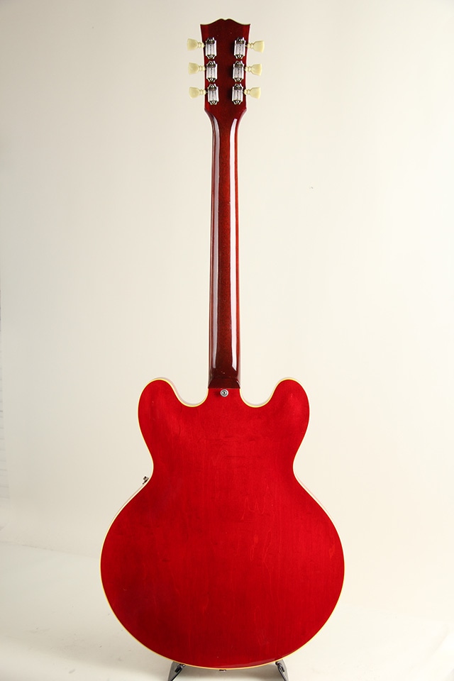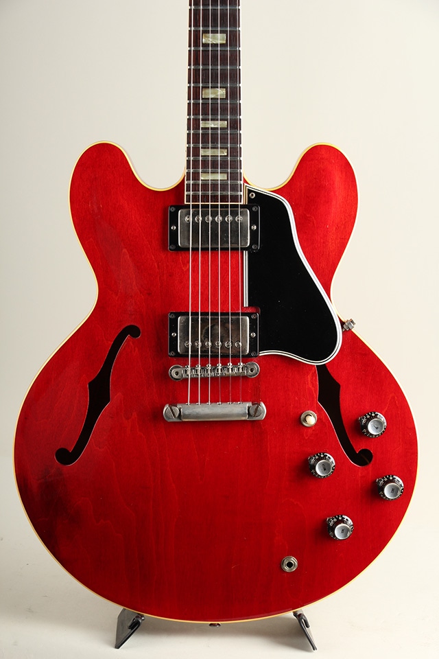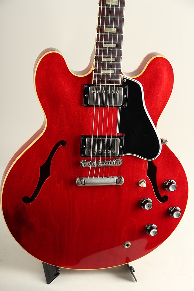 塗装の艶もしっかり残っておりチェリーのフェイドも少なく、年式からしてとてもクリーンな状態をキープしています。ボディトップ(エルボ部)一部に少しのオーバーラッカー有、テールピース、ブリッジサドル1つが交換。ネックコンディションも良好でトラスロッド余裕有、フレット残りもあり演奏面も良好です。オリジナルハードケースが付属します。