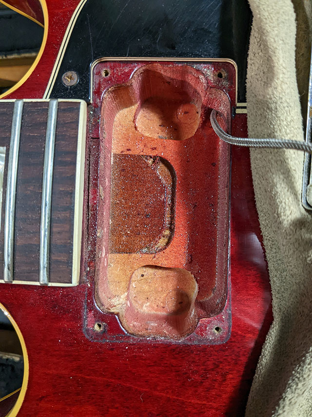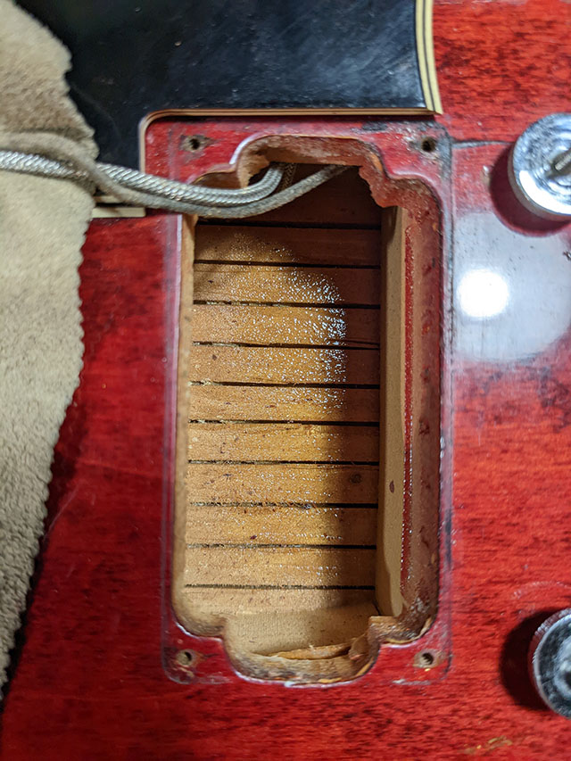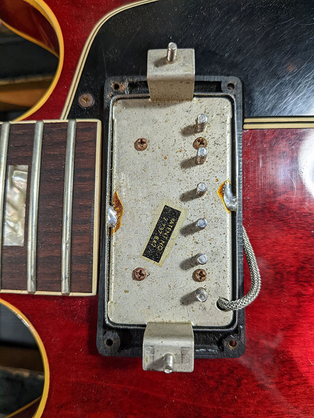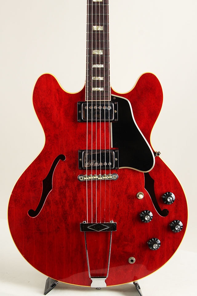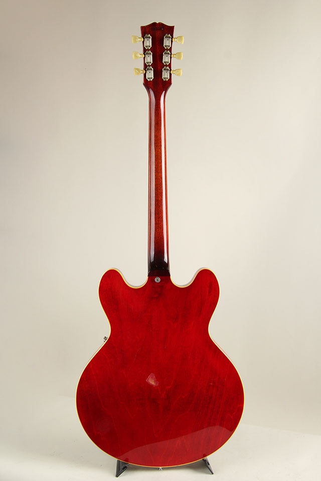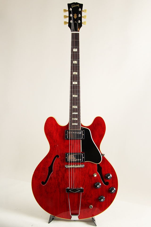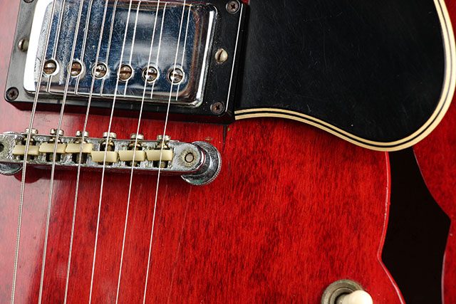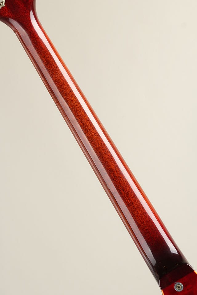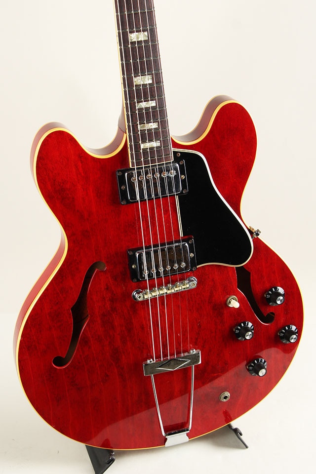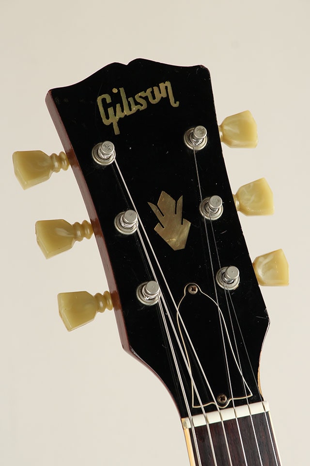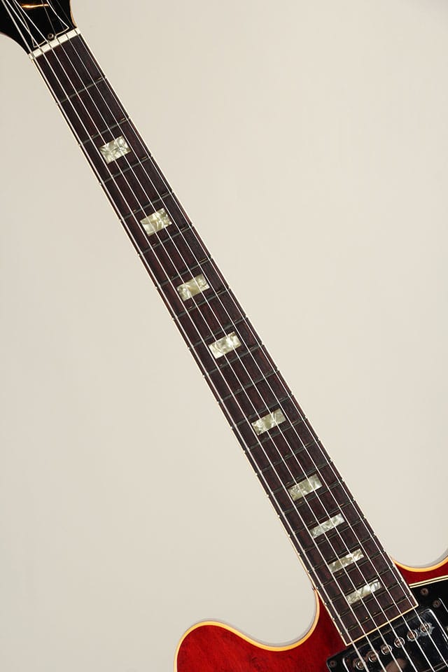 ボディ内部はセンターブロック中央部の1弦側に空洞が存在し、ソリッド過ぎない適度なホロウ感があるのが特徴の年代です。甘さと程よい空気感を持ちながら心地よく枯れており、非常に艶やかなトーンを聞かせてくれます。音像の芯も想像以上に太くしっかりとしており、タッチに対してのレスポンスも良く、強いタッチに対して瑞々しく弾けるような感触はこの年代ならではの魅力です。