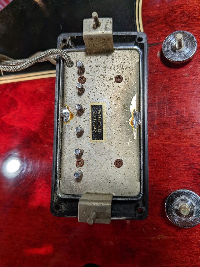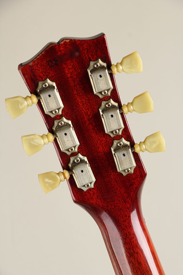 状態としましてナット/フレットの他少しのビス等が交換。年式からキズや塗装チェッキング等はある程度見られますがチェリーのフェイドも少なく塗装の艶も残っており良好な状態をキープしております。ネック、トラスロッド周りも良好で、フレット残りもまだあり演奏面も良好です。
