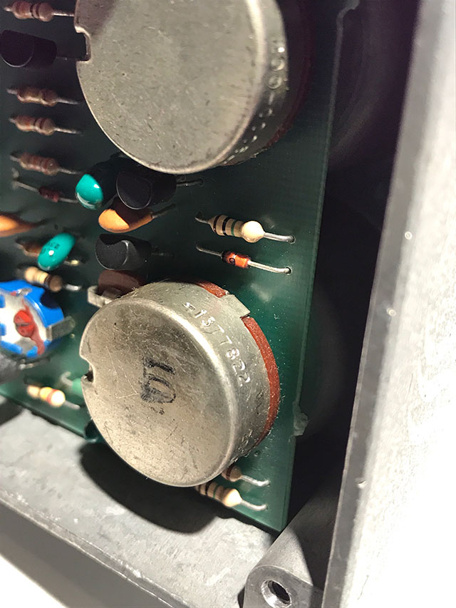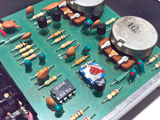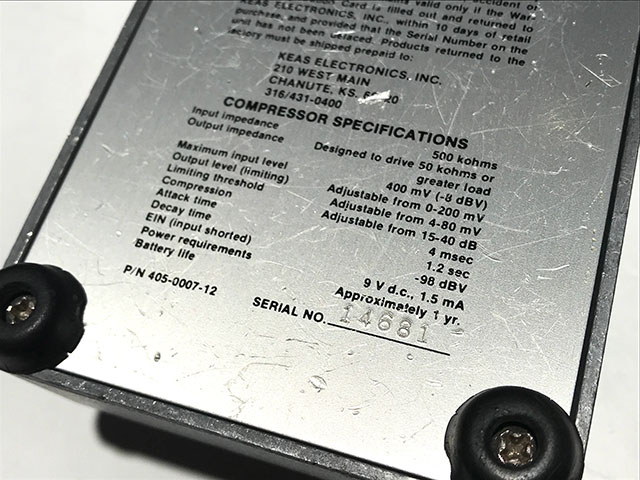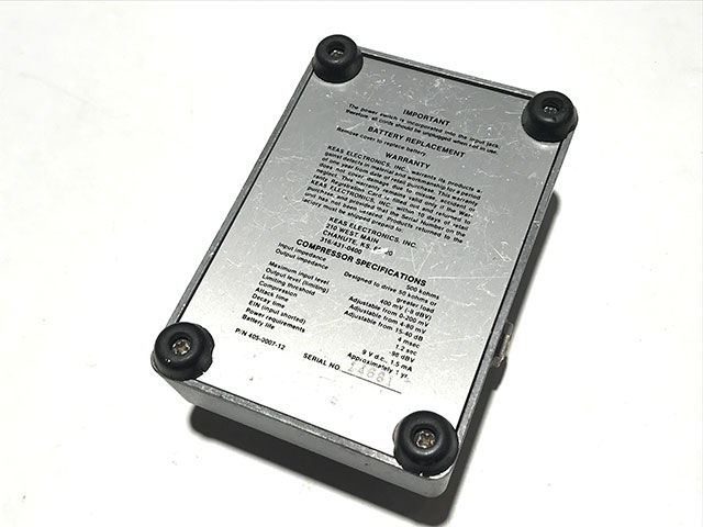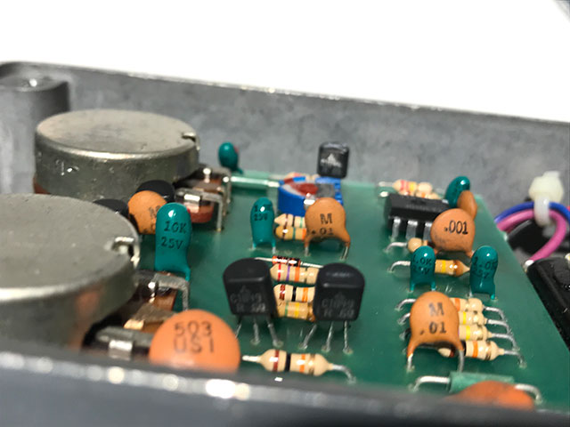 当機はレベル・コントロールノブが"OUTPUT"と表記されているUSA (Keas Electronics製) 初期の個体です。基盤は明るいグリーン、オペアンプはRCA製"CA3080E"、トランジスタは2SC1849が2個搭載、ポッドデイトデイトより1978年製と考えられます。ROSS独特の仕様で、回路基板とポットが一体化になっているのも特徴のひとつ。