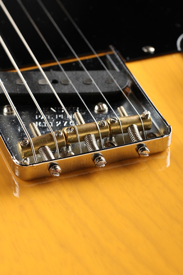 当機は楽器店オーダーの1本で、1952年仕様をベースに王道「バタースコッチ・ブロンドのブラックガード」を極薄のラッカー塗装でリクエストしたオーダーモデルとなります。